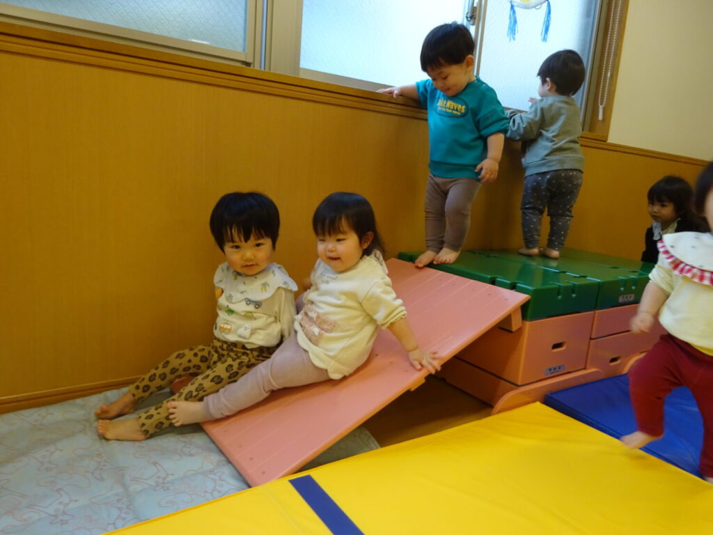 坂道は、歩いて上ったり下りたりする子や、座って滑る子、お腹をつけてすべる子等、自分の好きなやり方で楽しんでいましたよ(*^-^*)