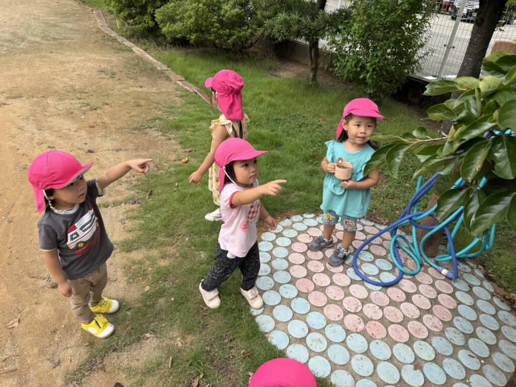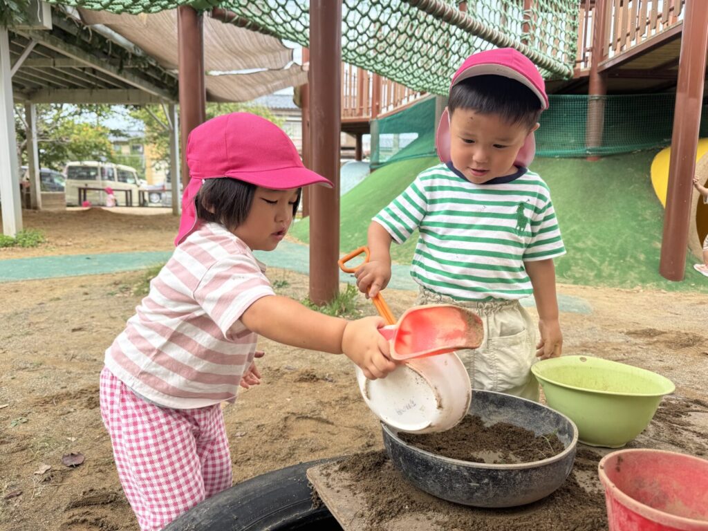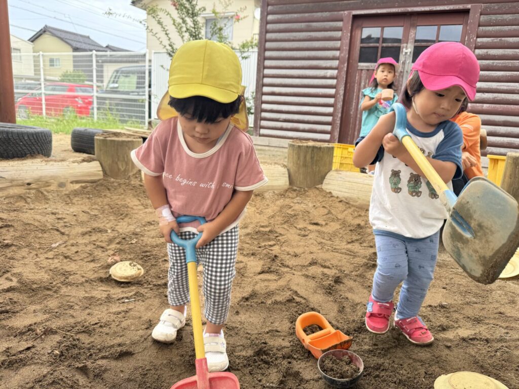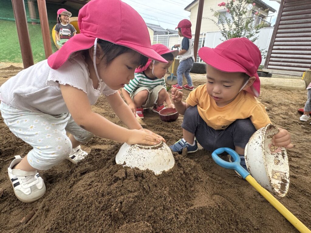 砂場でいろんなものを作ったり、虫をさがしたり、赤ちゃんダンゴ虫を見つけてみんなきゃー!!と騒いでいました(笑)
