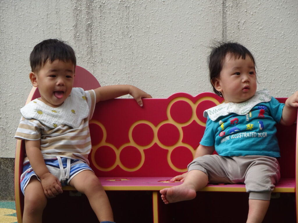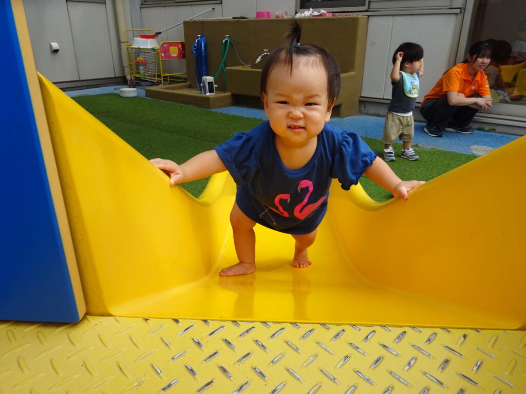 外に出ると一歳児さんのお部屋が見え覗いている子もいました。