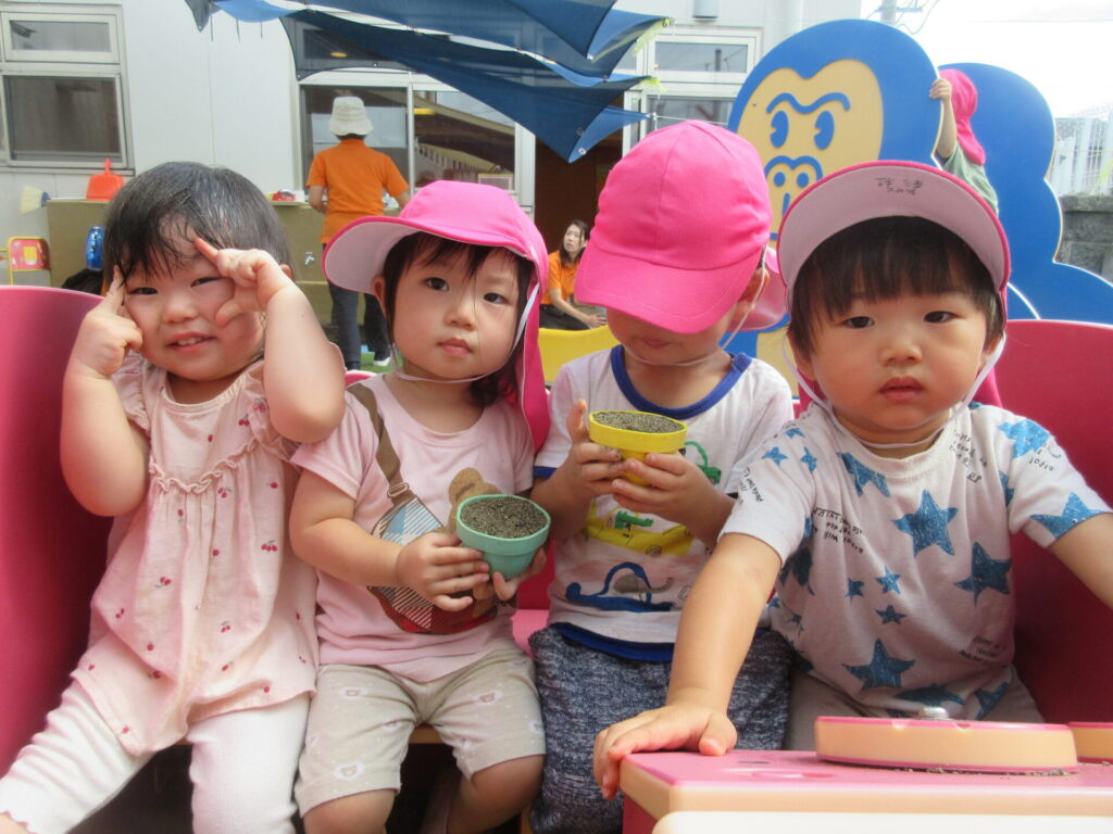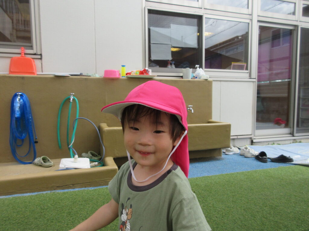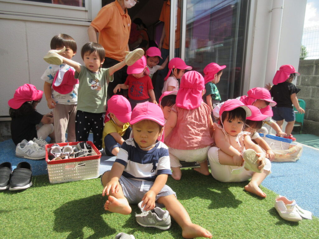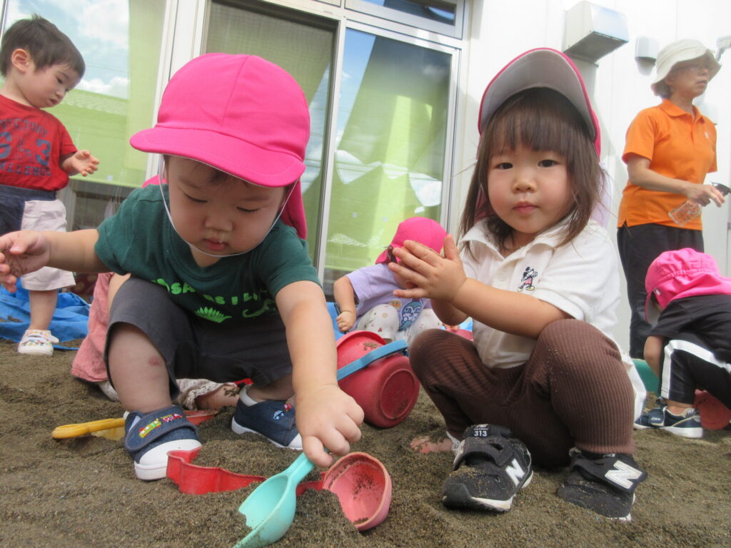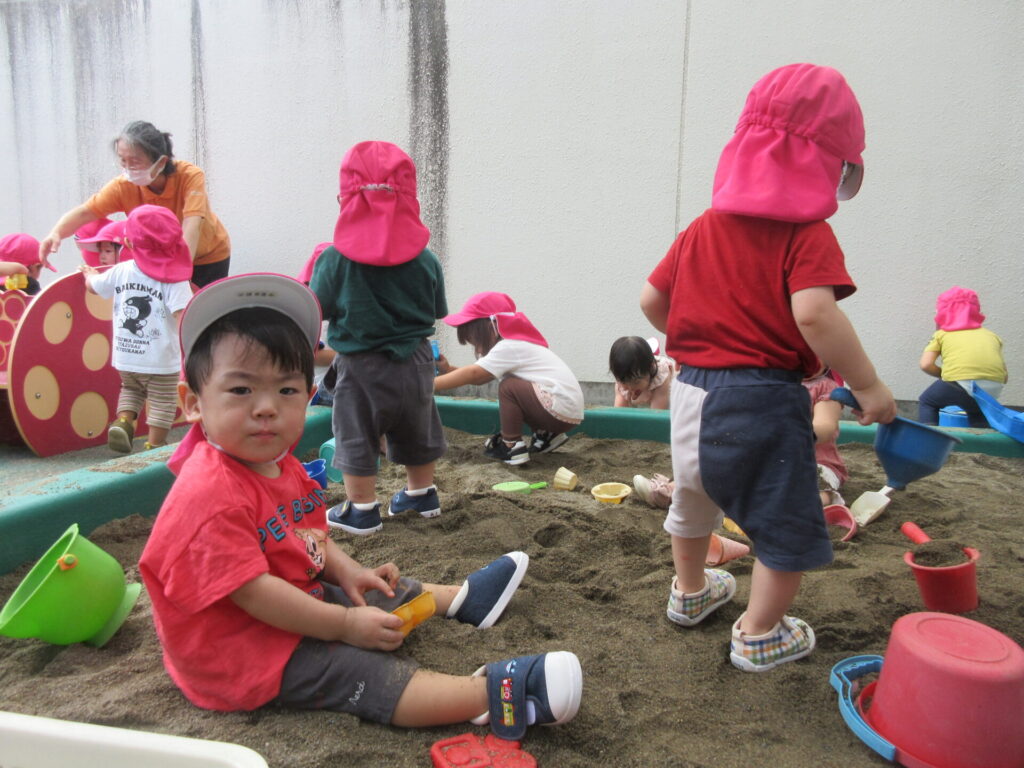 ミストを浴びながら中庭で砂あそびを楽しみました。