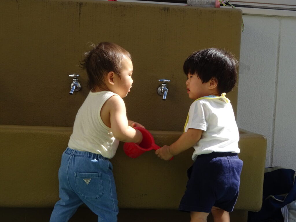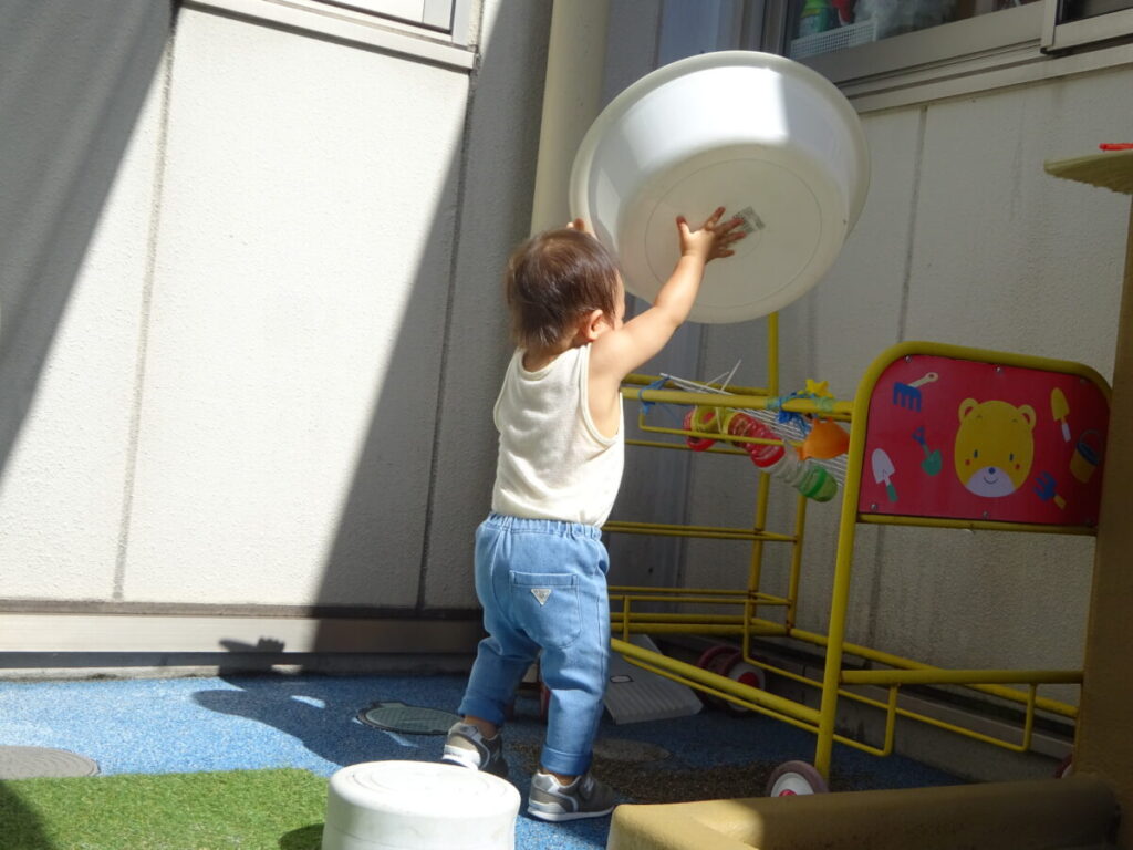 置いてあったタライを持ってきたお友だち きっと水あそびがしたかったのかもしれませんね。