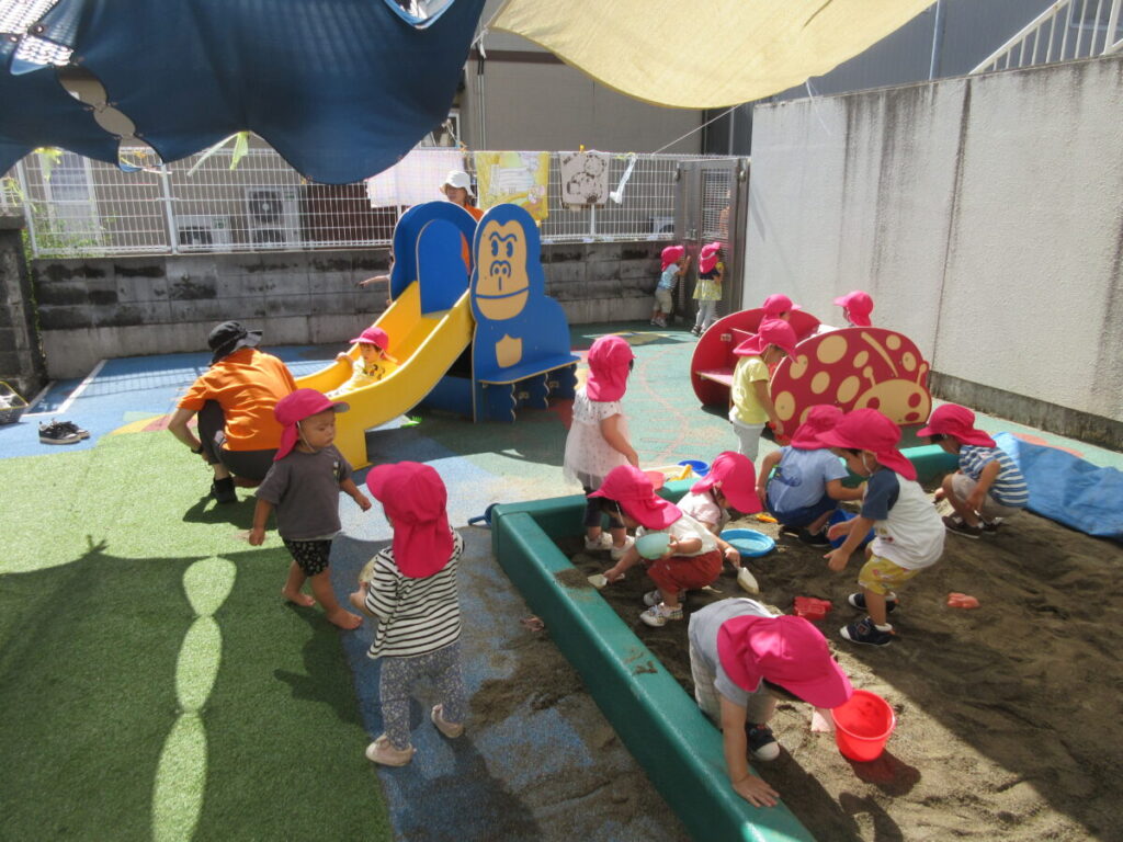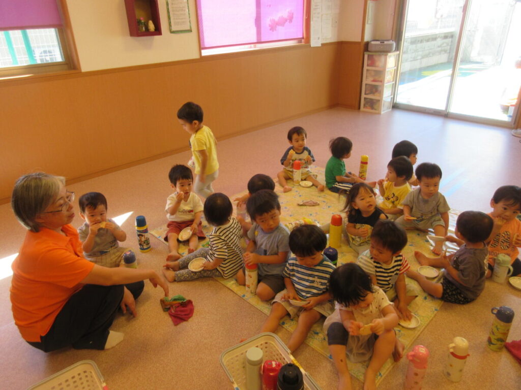 避難訓練のあとに、たんぽぽ組でおやつ。