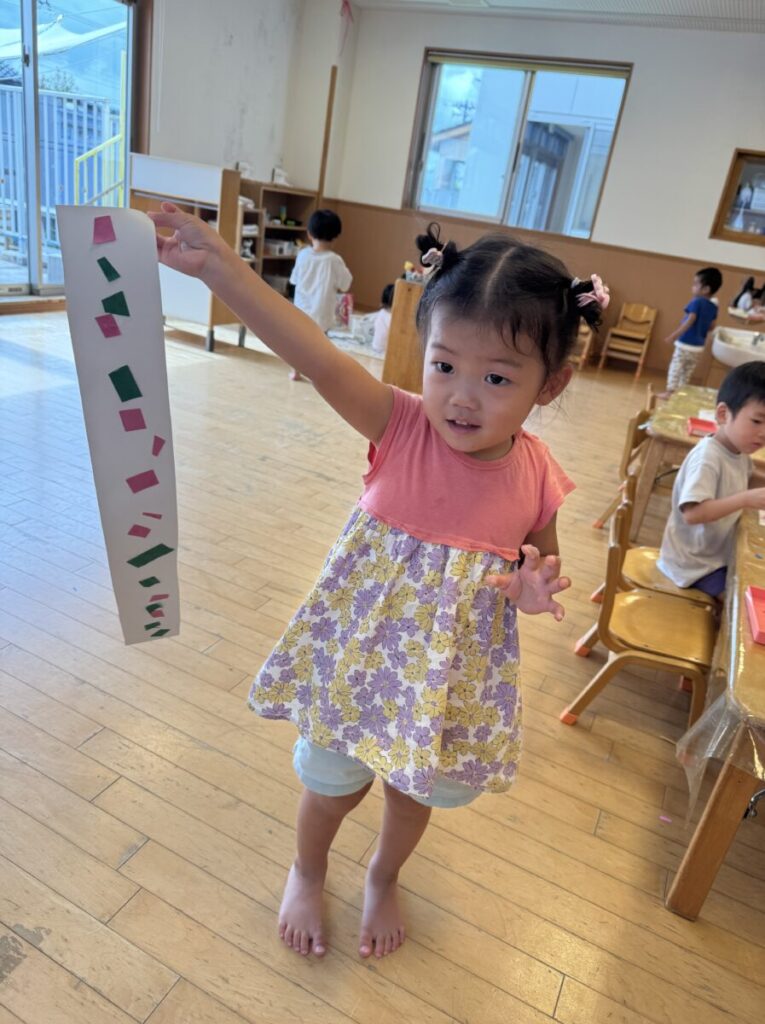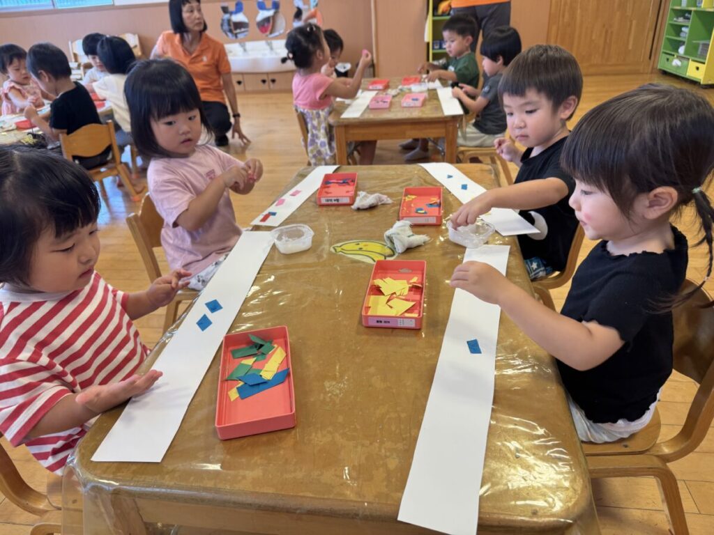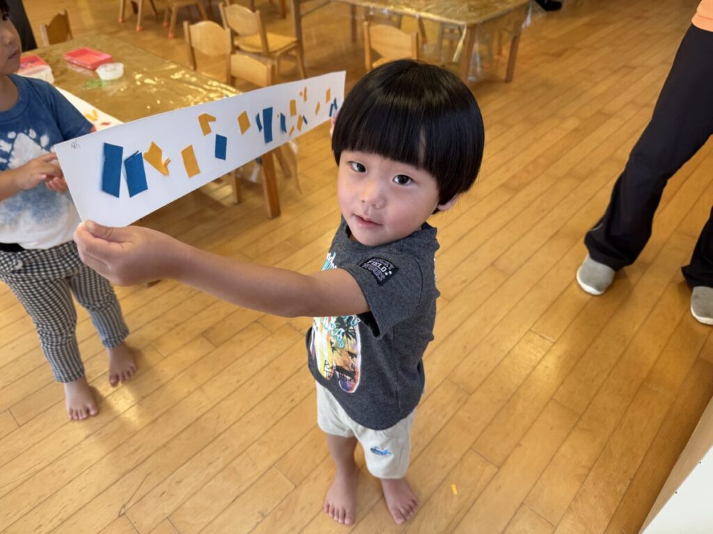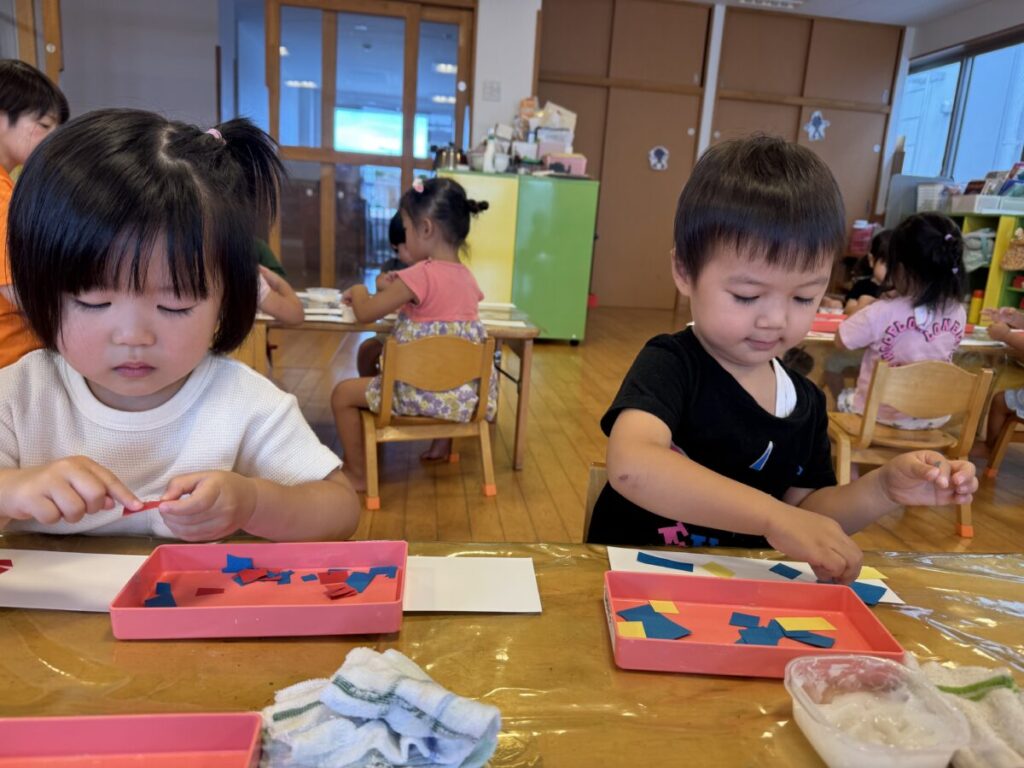 切ったものが細かく、小さいので、どうかな?と思いましたが、みんな器用にのりをつけて貼っていたり、台紙ではなく画用紙にのりを付けるということも覚えていました!