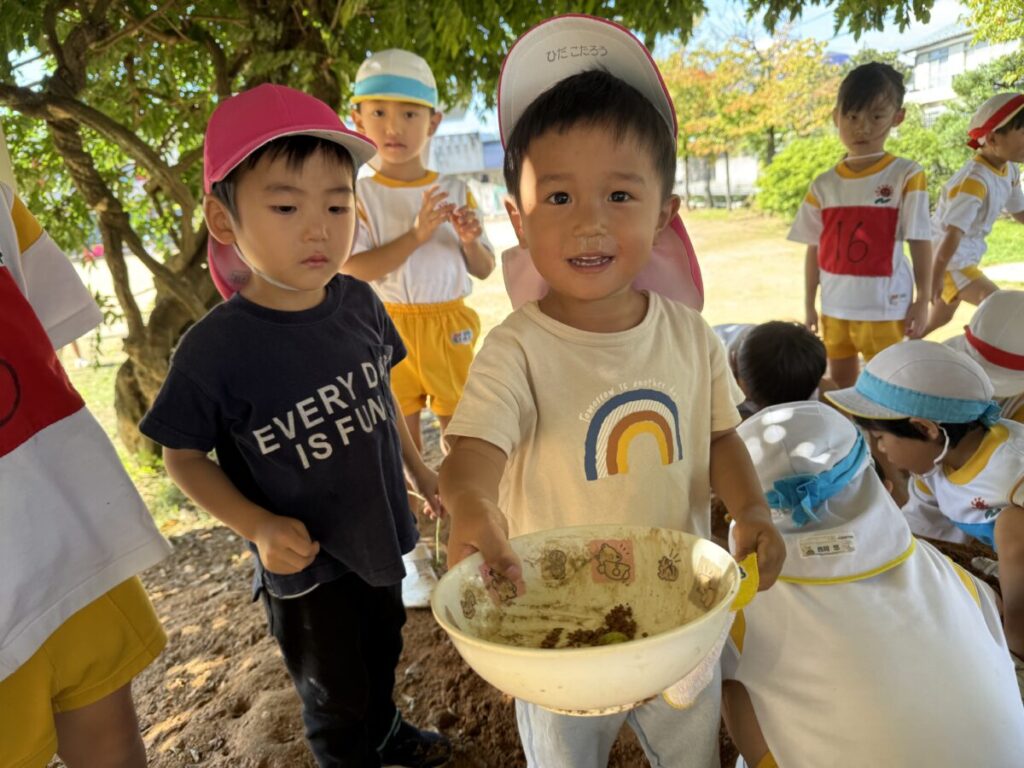 年長さんが後から来て、虫を発見!一緒に交じりたくてついて歩き、幼虫をお兄ちゃんにもらったようで、喜んでいました!