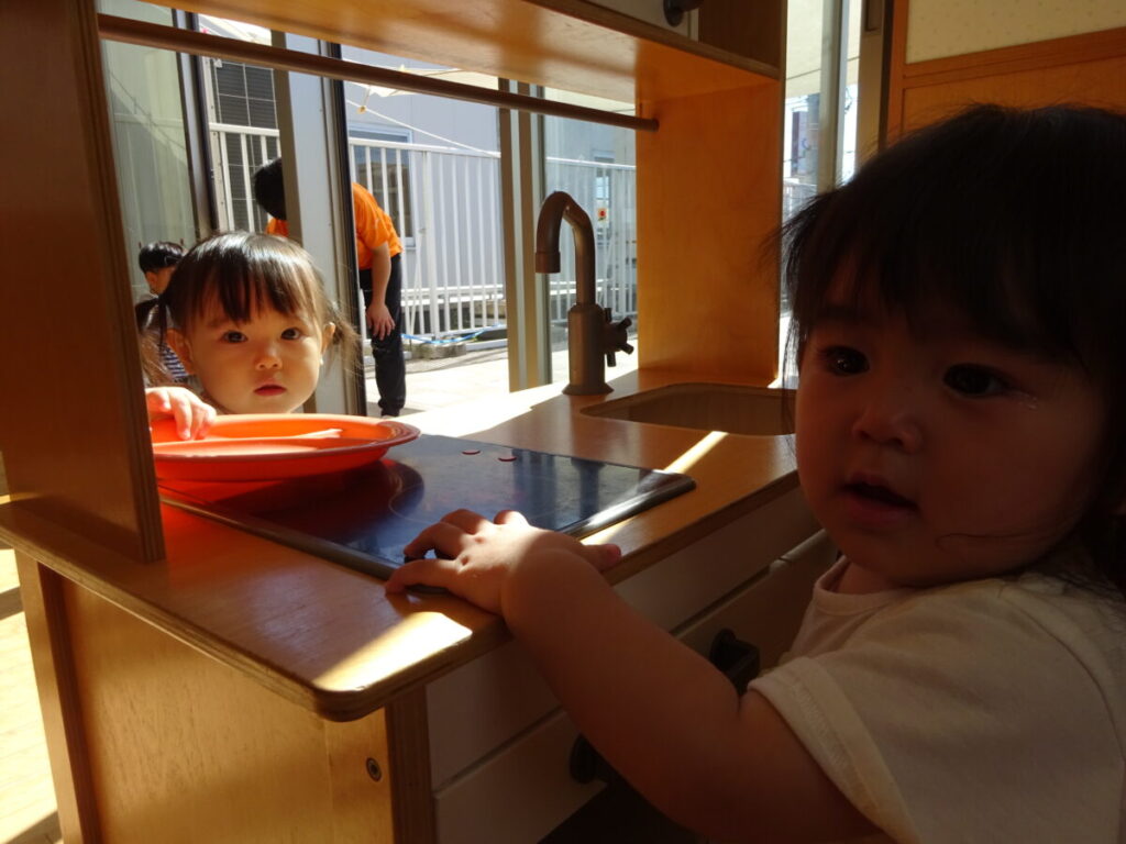 ベランダに出て外の空気を吸ったり、お部屋でおままごとをしてみたり、絵本コーナーであそんだりと2階をあっちへ行ったりこっちへ行ったり、みんな楽しそうにあそんでいました。