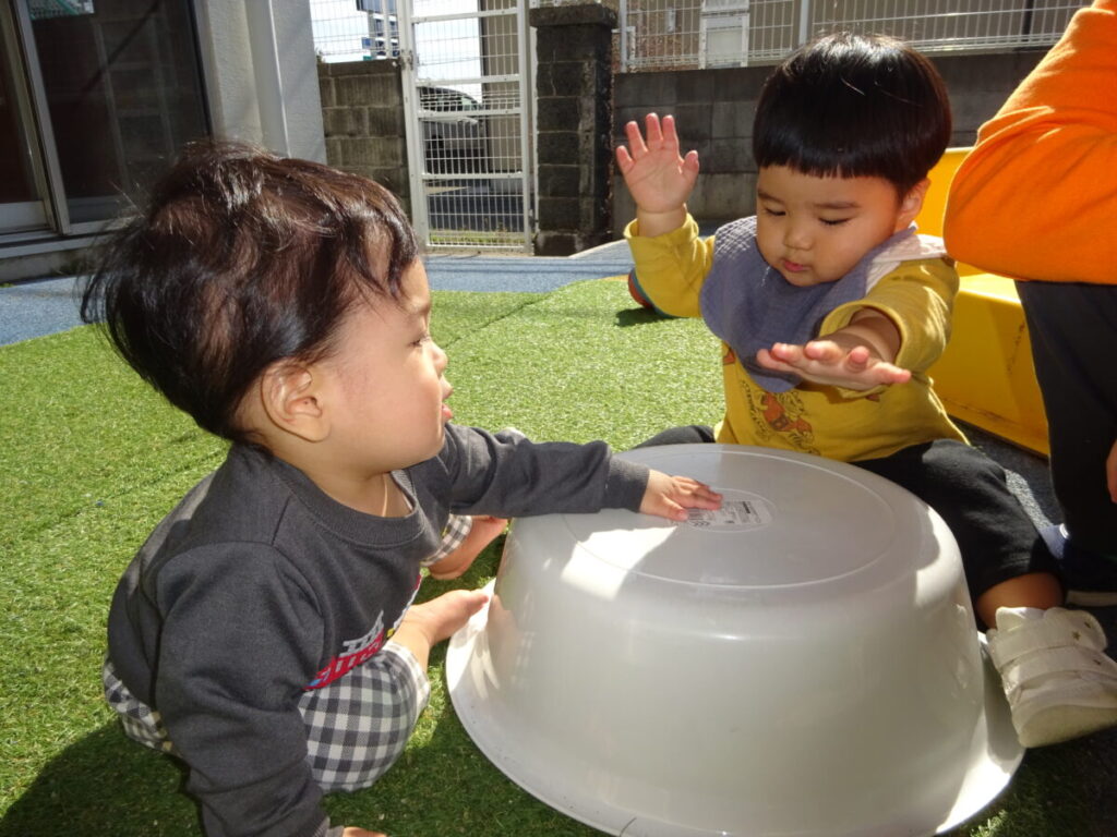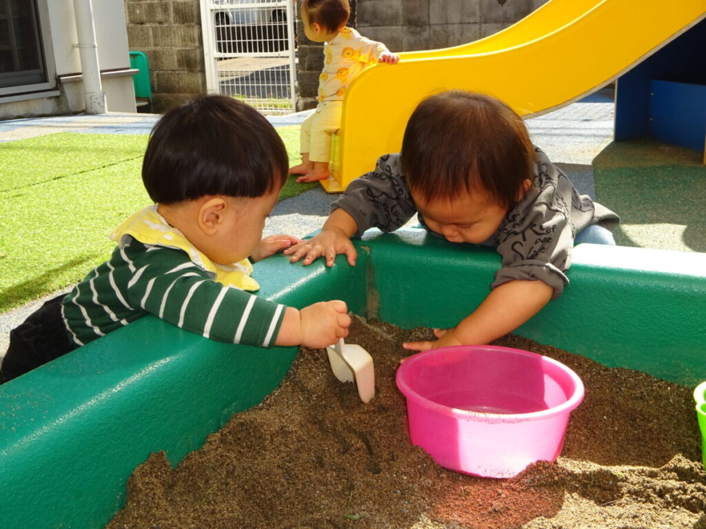 真剣な表情で、すなをカシャカシャとたたいたり、タライの中に運んだりを楽しんでいたお友達です。