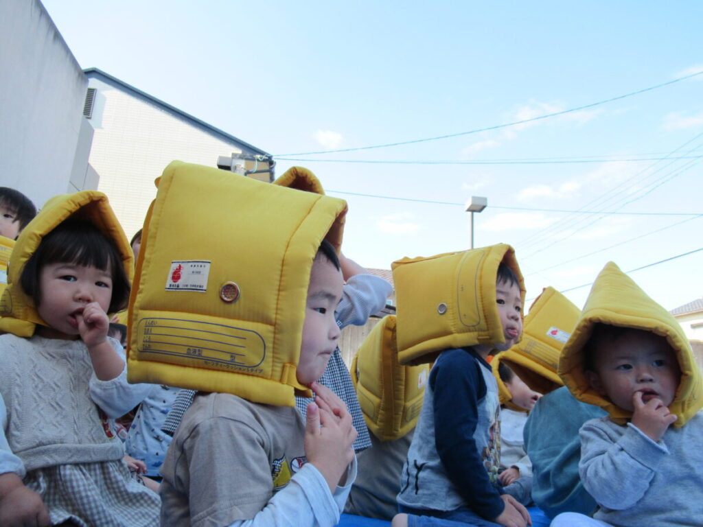 その遊びの前には,防災頭巾をかぶって
