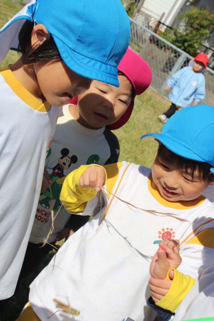 バッタさんやカエルさんを発見したり、草刈りされた草を集めて遊んだり
