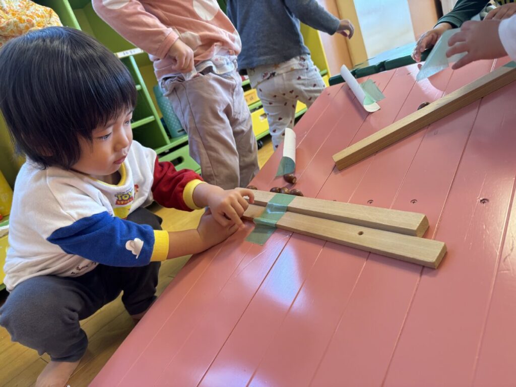 朝のコーナーあそびの時間。どんぐり転がしコーナーを用意しました。
