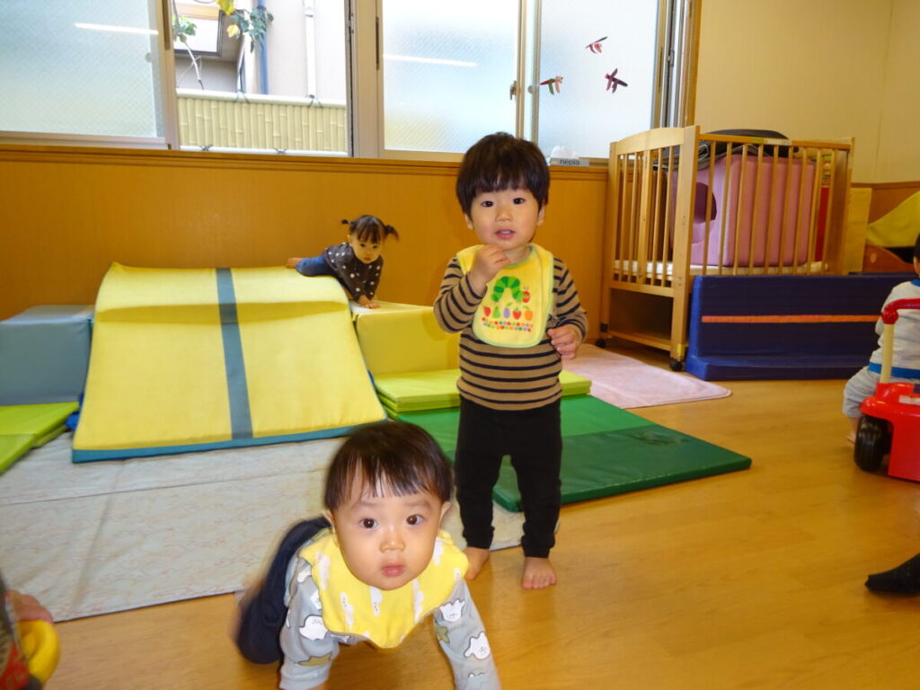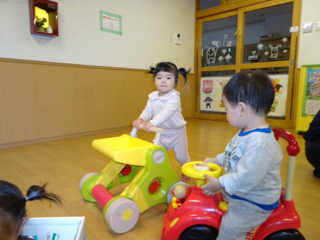まだ、自分では難しいお友だちは、車に乗っているだけでも嬉しそう(^^♪ そして、手押し車の変わりに押して歩いたりと、それぞれのあそび方で楽しんでいました(^^)/