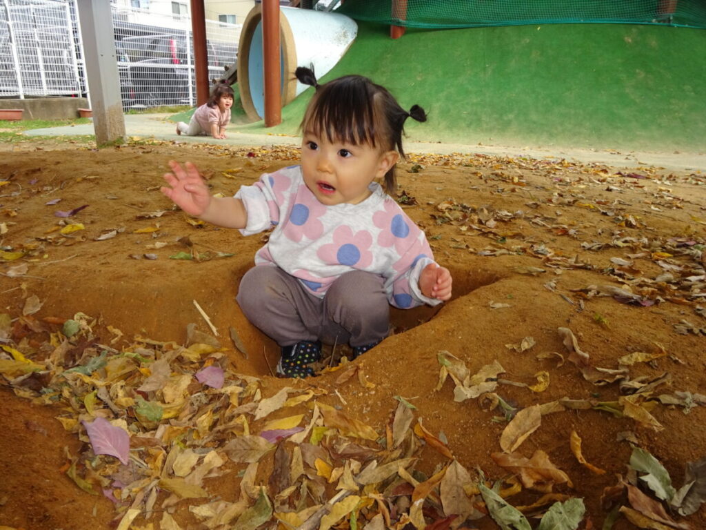 幼稚園のお友だちが穴を掘ったのかな?ちょうどいいスペースに入って、私の場所み~つけた―(^^♪