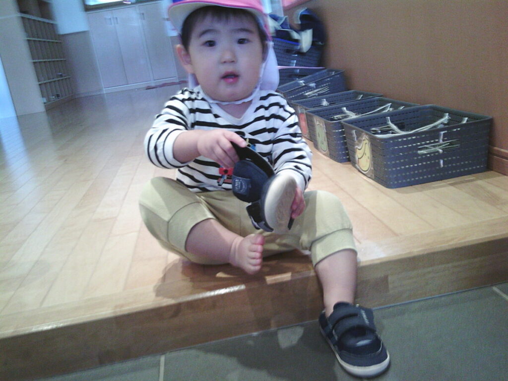 カメラ目線ですが、この後、靴を見て頑張って履いていました。