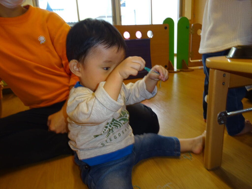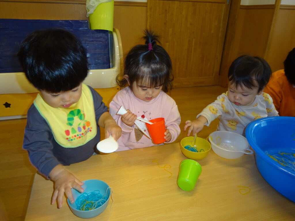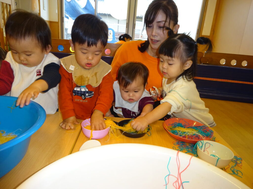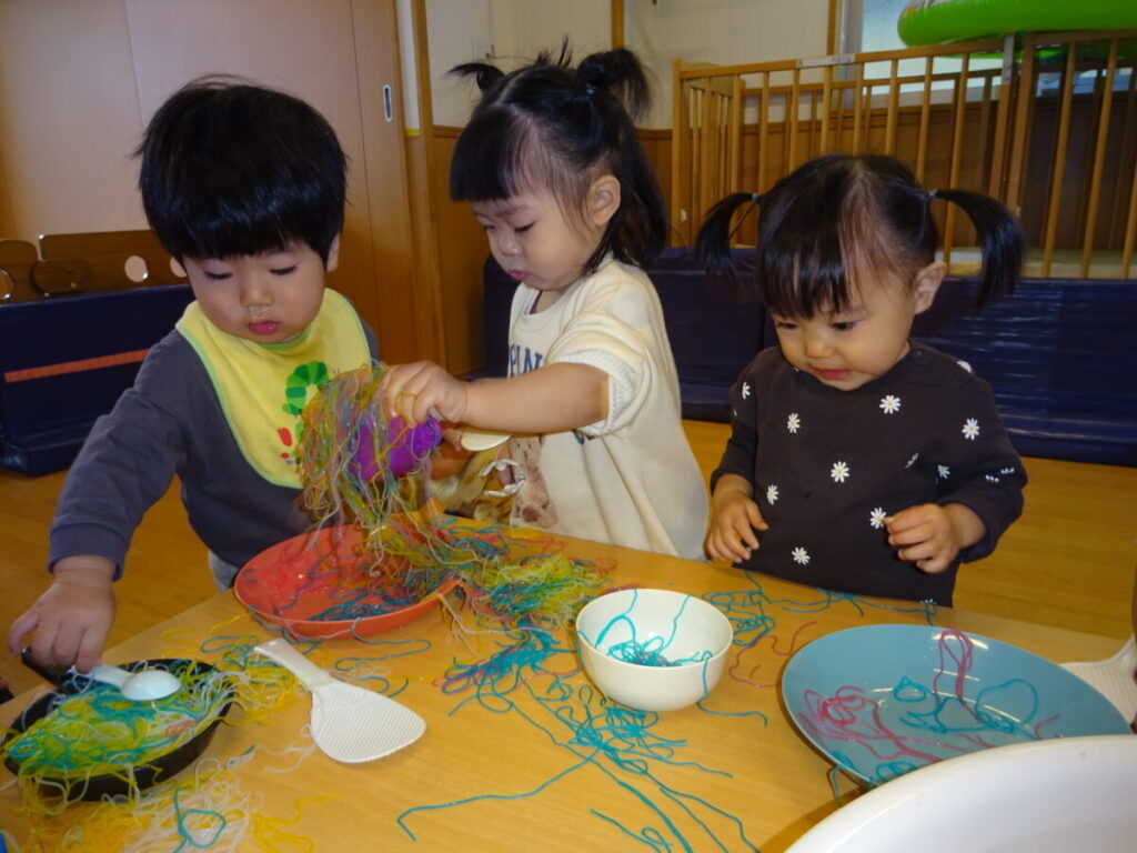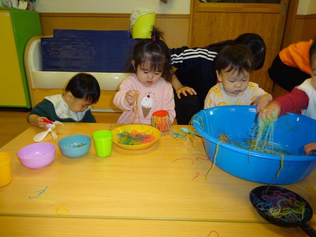 綺麗な色がついている春雨に興味津々のお友だち お茶碗やお皿に入れて混ぜてみたり、手で引っ張ってみたりと集中してあそんでいました。