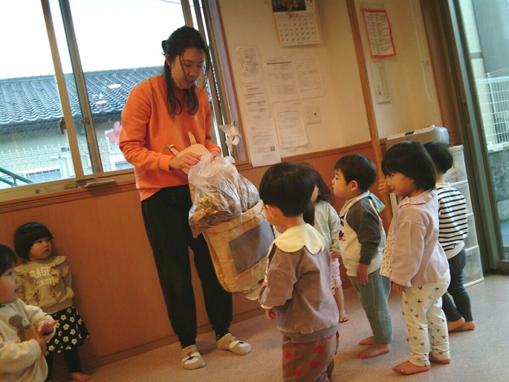 朝のおやつの前に、昨日園庭で拾った落ち葉をカンガルーさんに見せてもらいました。