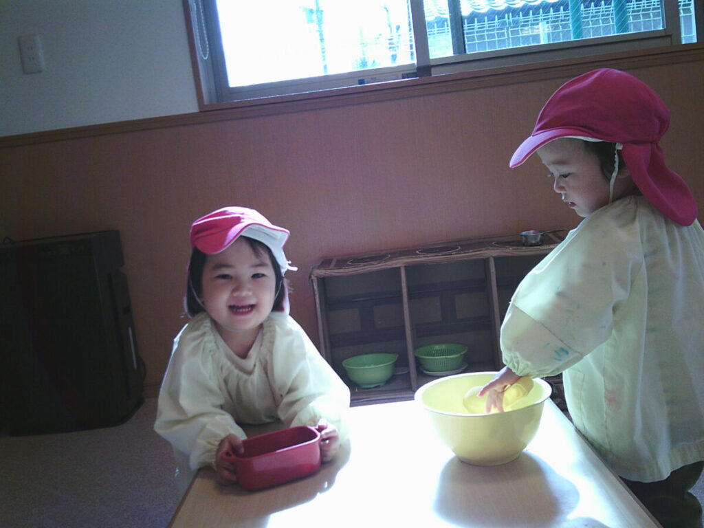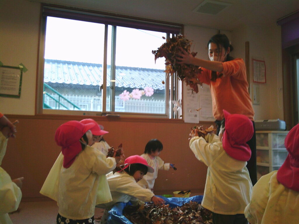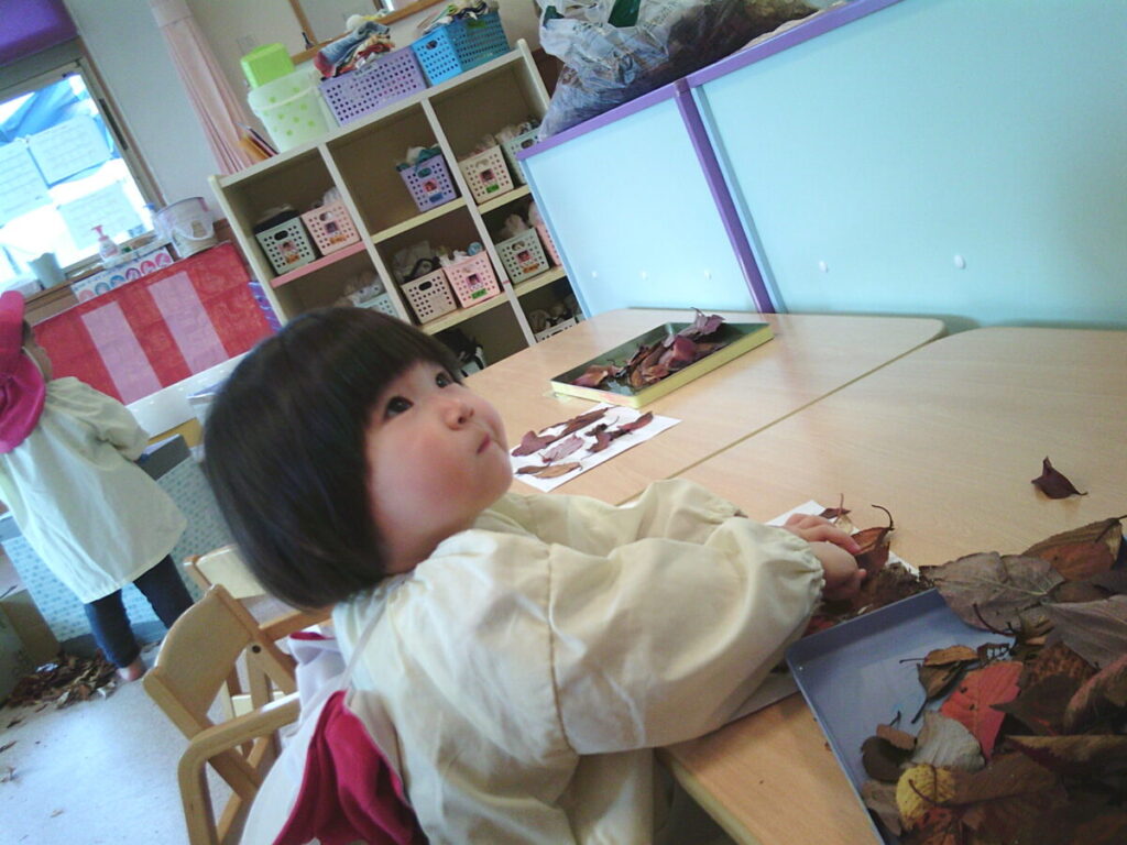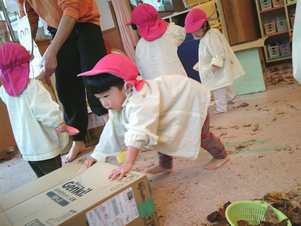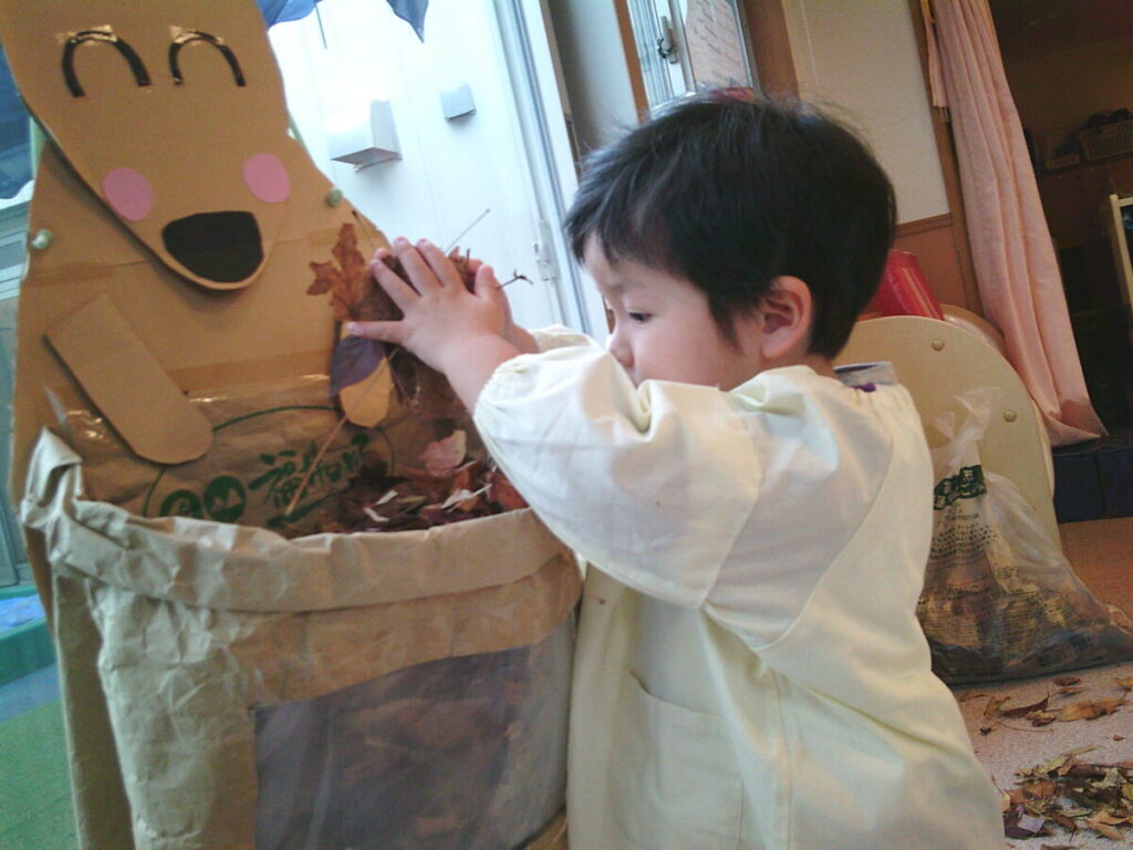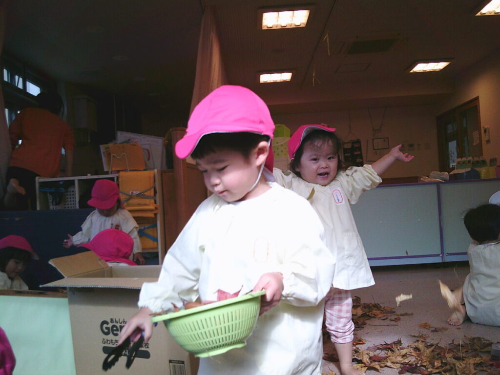 おやつを食べたら、この落ち葉さんたちで遊びましょう。