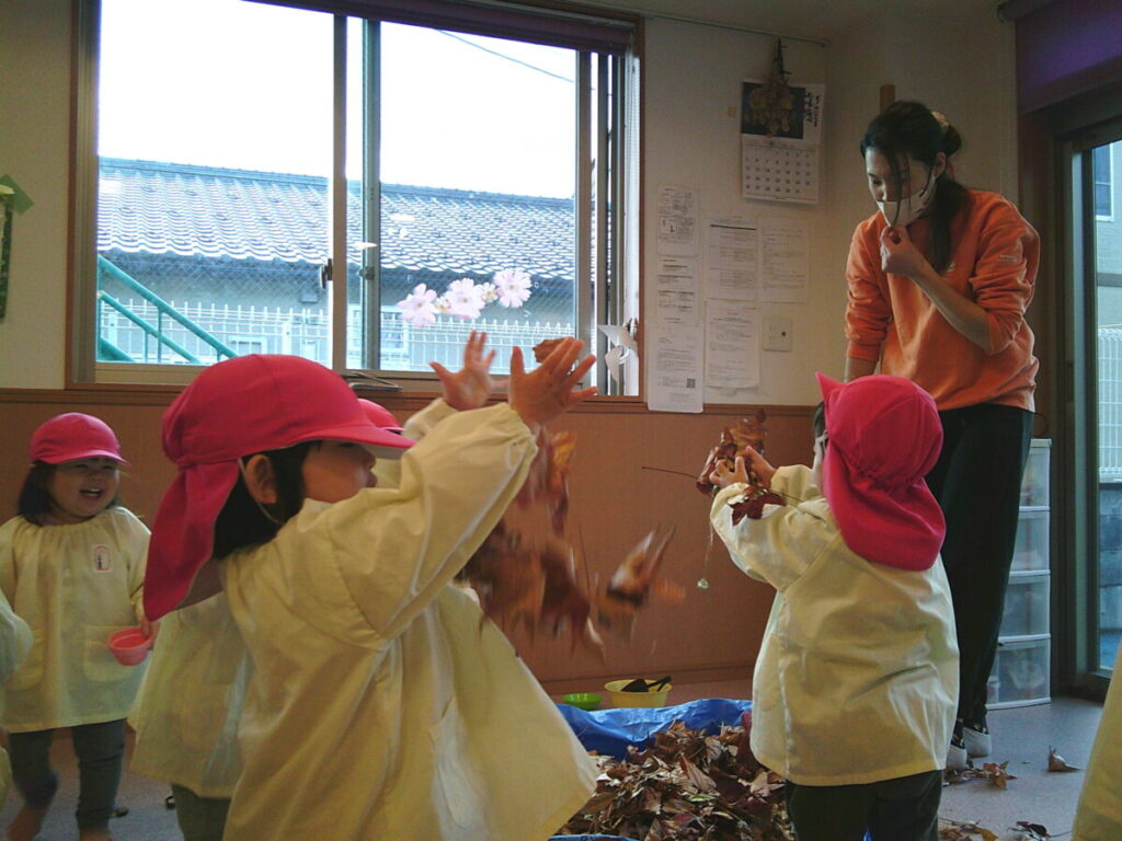 戸外には出られませんでしたが、お部屋で落ち葉あそびをしました。