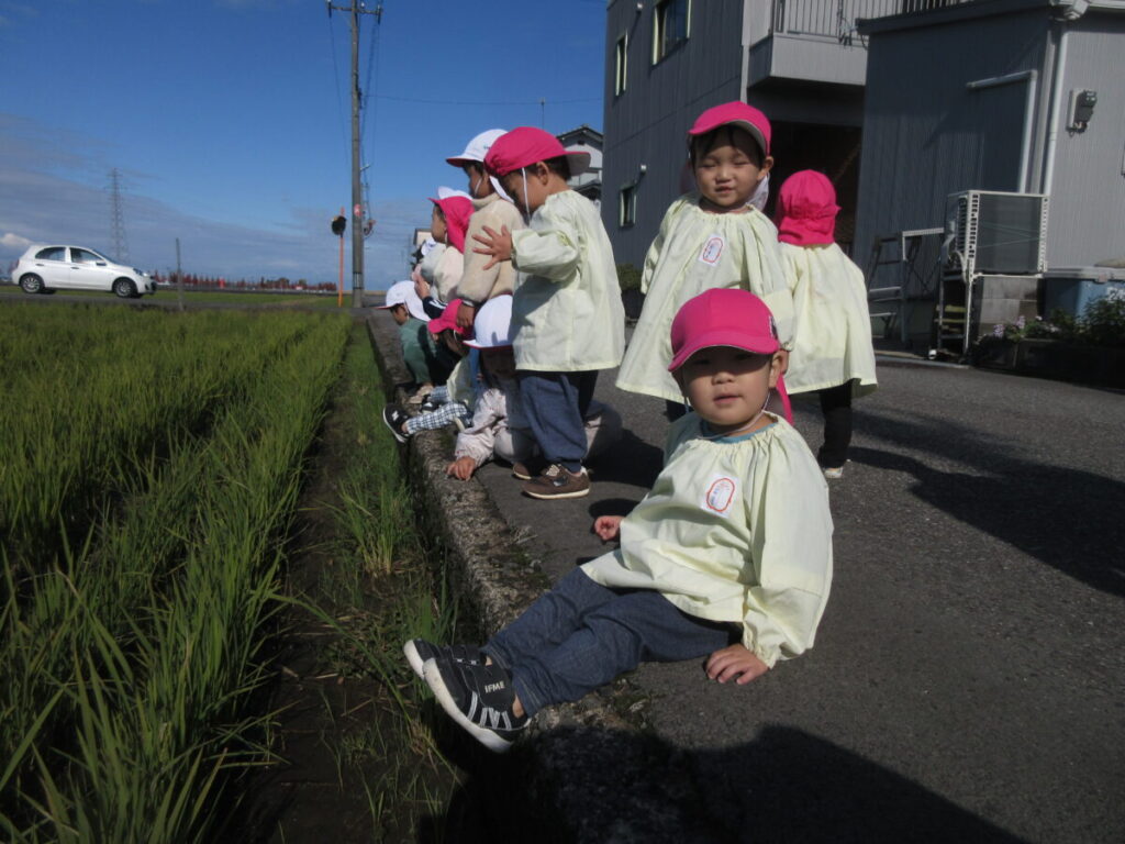 青い空。緑の田んぼ!向こうの道路には働く車!