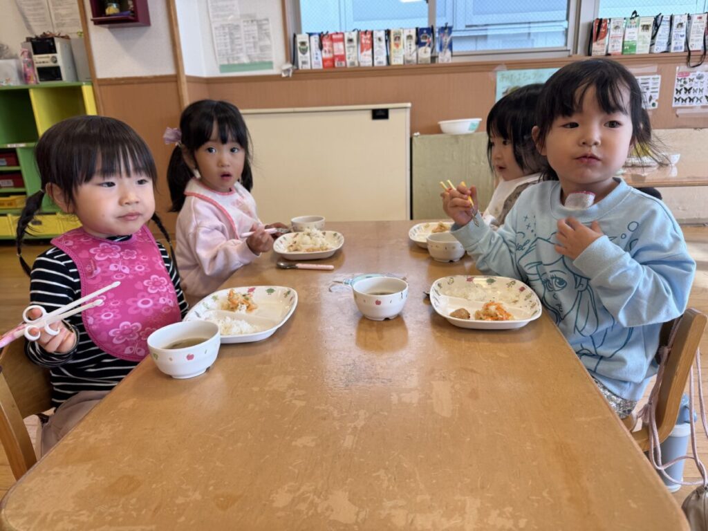 お部屋に戻り、半分にわかれて一緒に給食もいただきました。