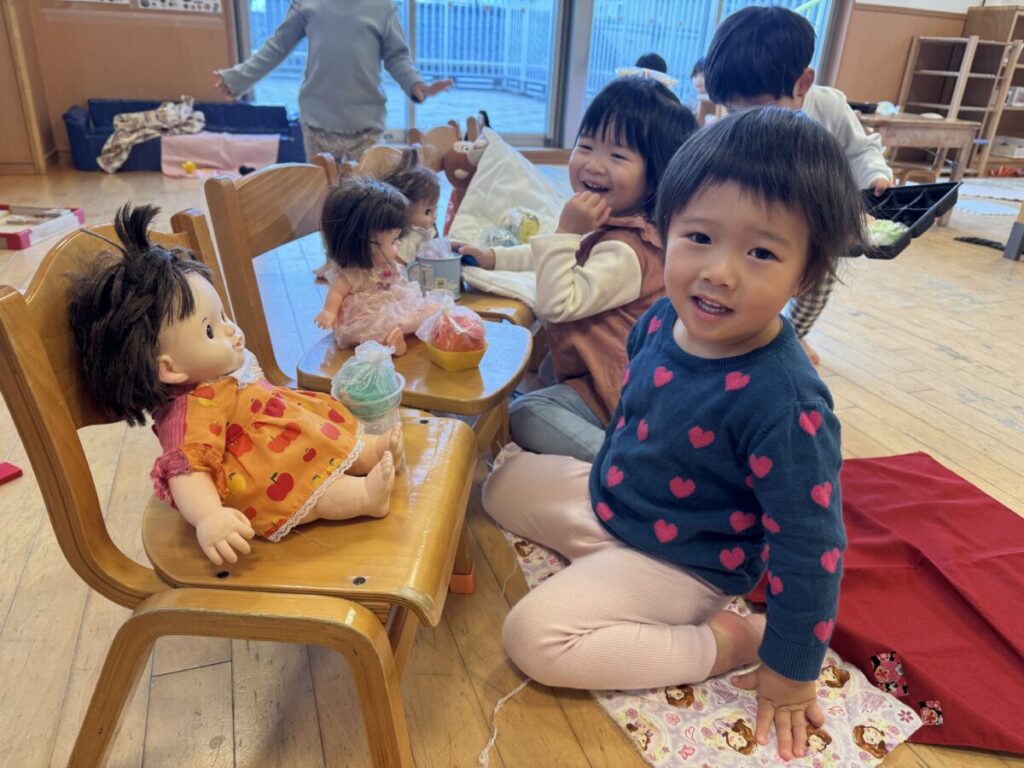 あかちゃんを座らせて、誕生会が開かれました!!
