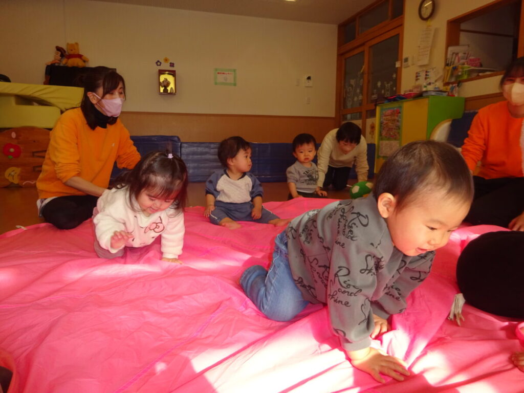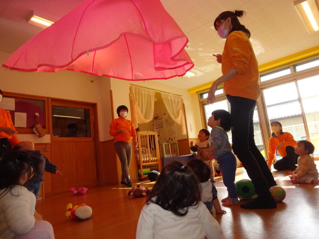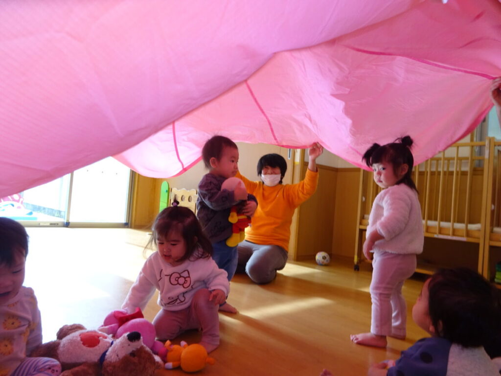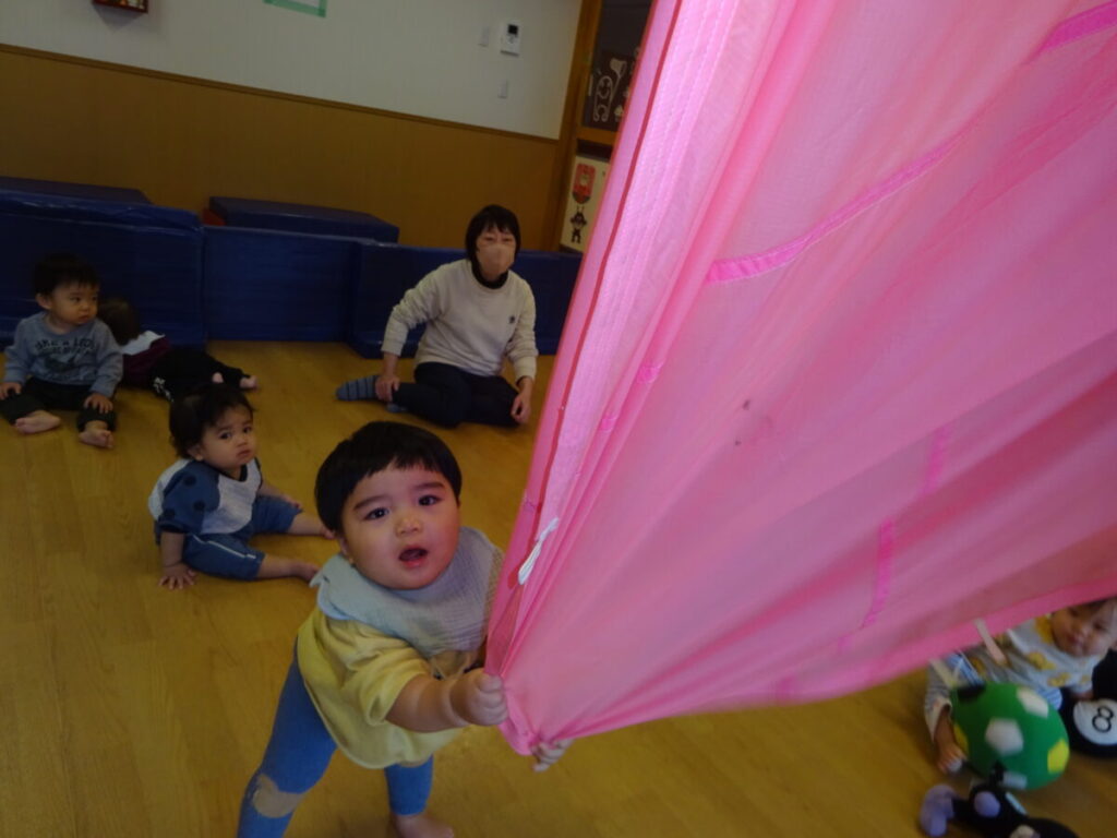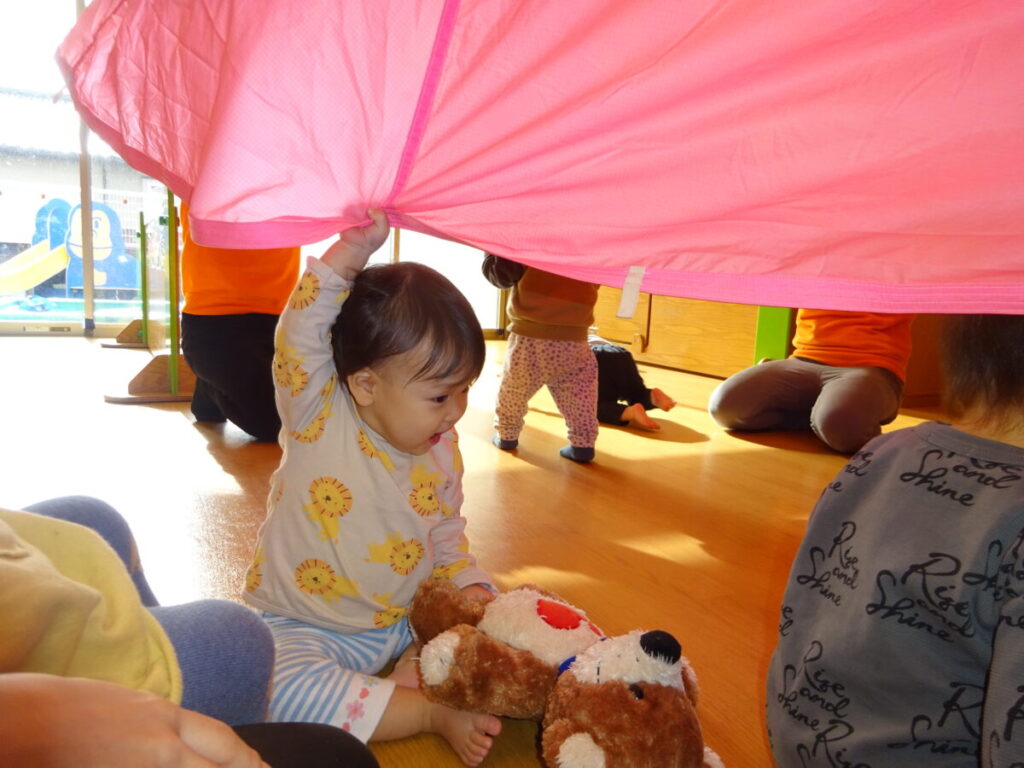 パラバルーンの中におもちゃを隠して「さあ、中に何が入っているかな?」の言葉でみんなパラバルーンをめくっておもちゃ探しをしていましたよ。
