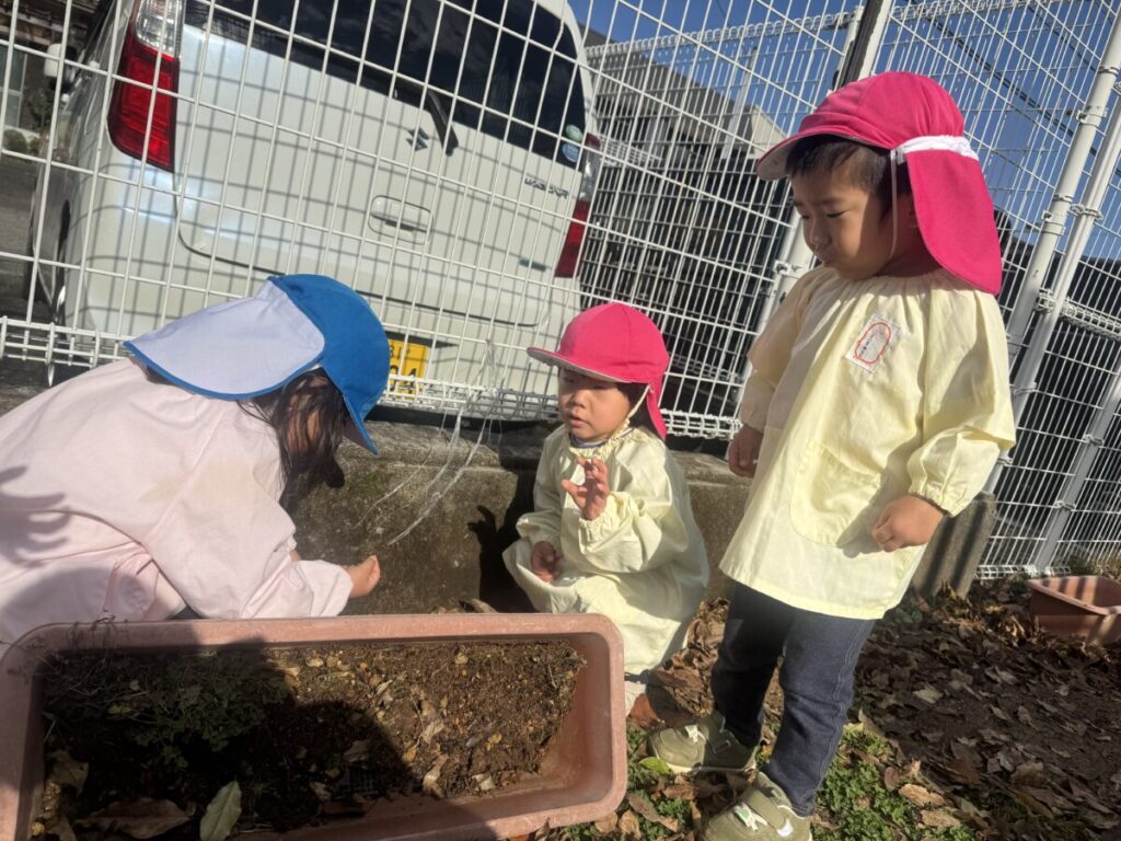 年中さんが植木鉢の下から虫を探している所を一緒に観察👀