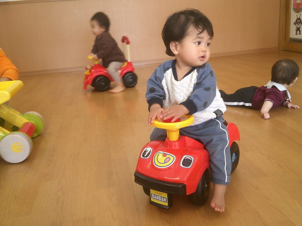 車に乗ってスピードよく走ったり保育者に押してもらったりして楽しんでいました。