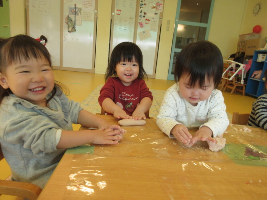 今日のコーナーあそびでは、昨日の続きのパン粉粘土をしました。