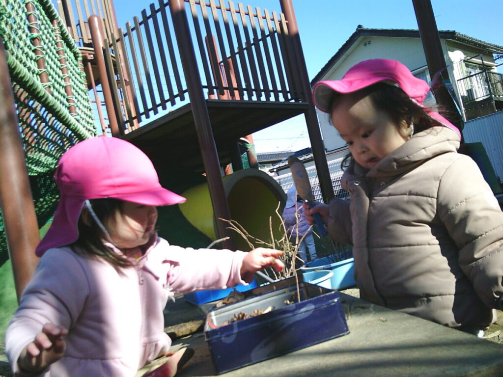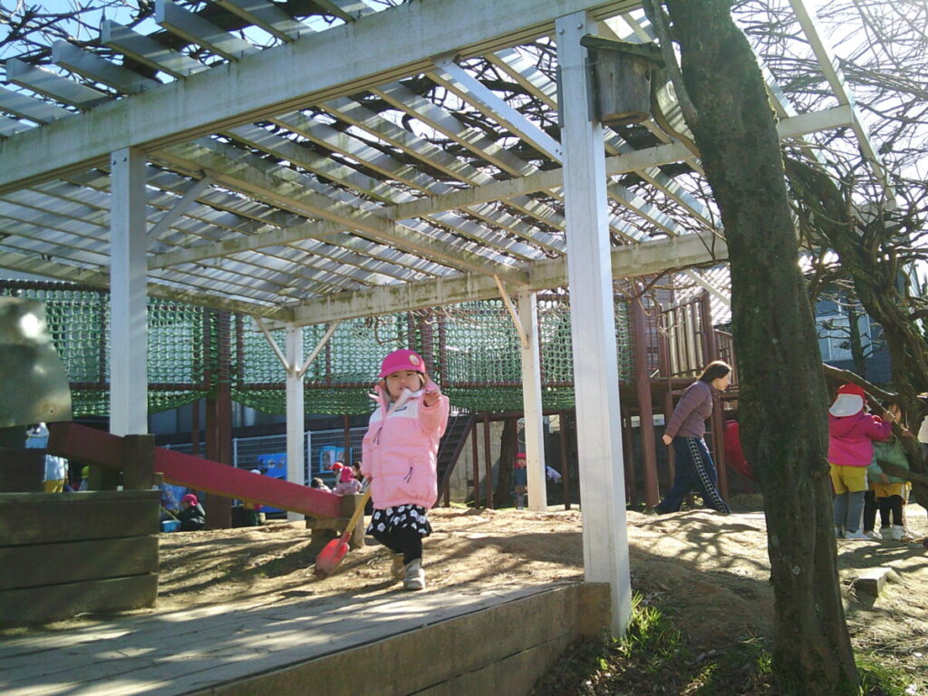 幼稚園のお兄さん、お姉さんたちもいて、砂場の横に素敵な木の枝や落ち葉が…