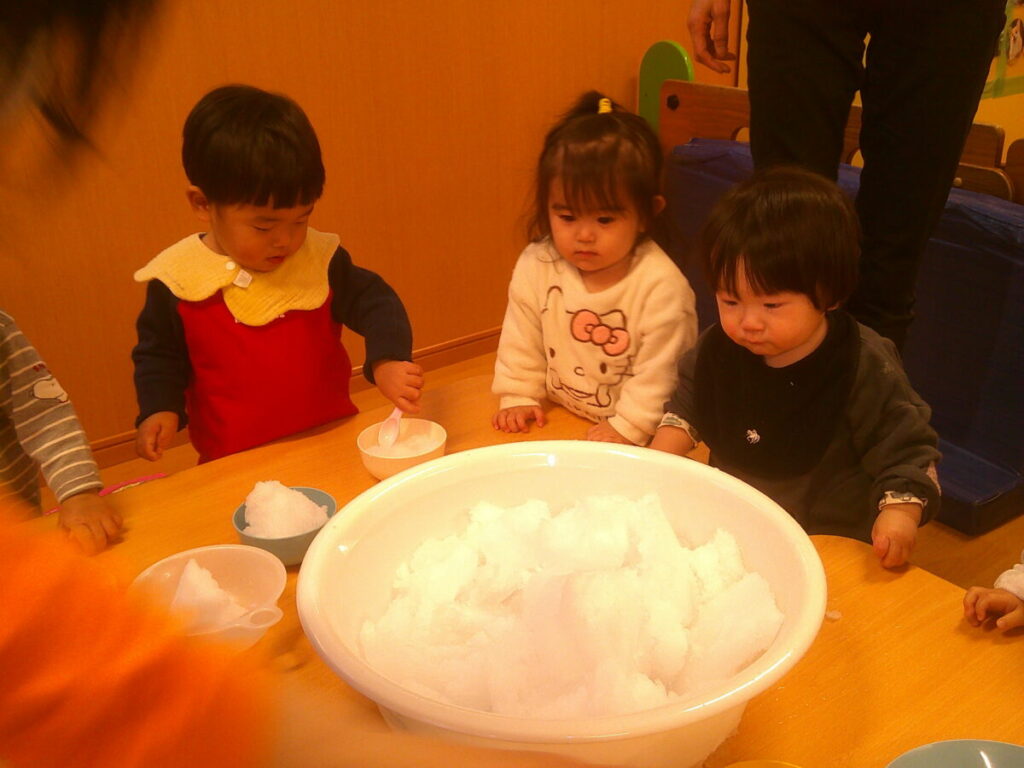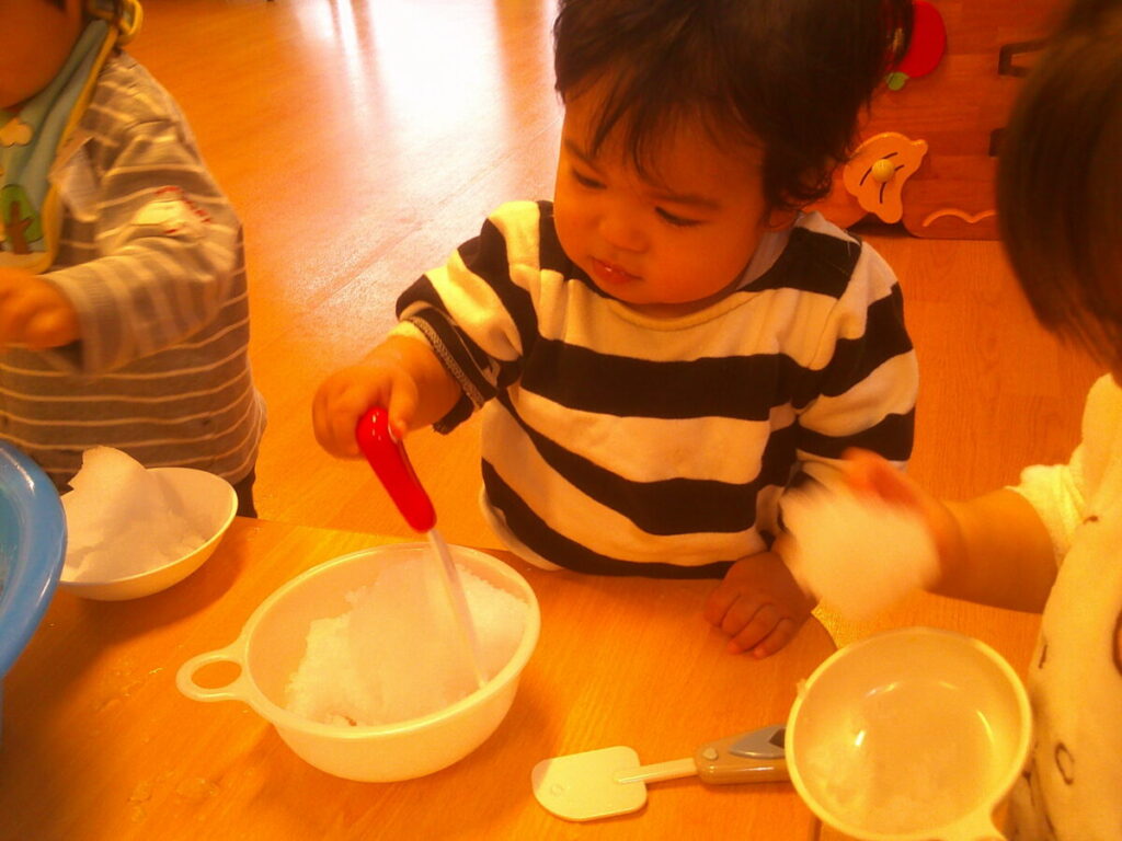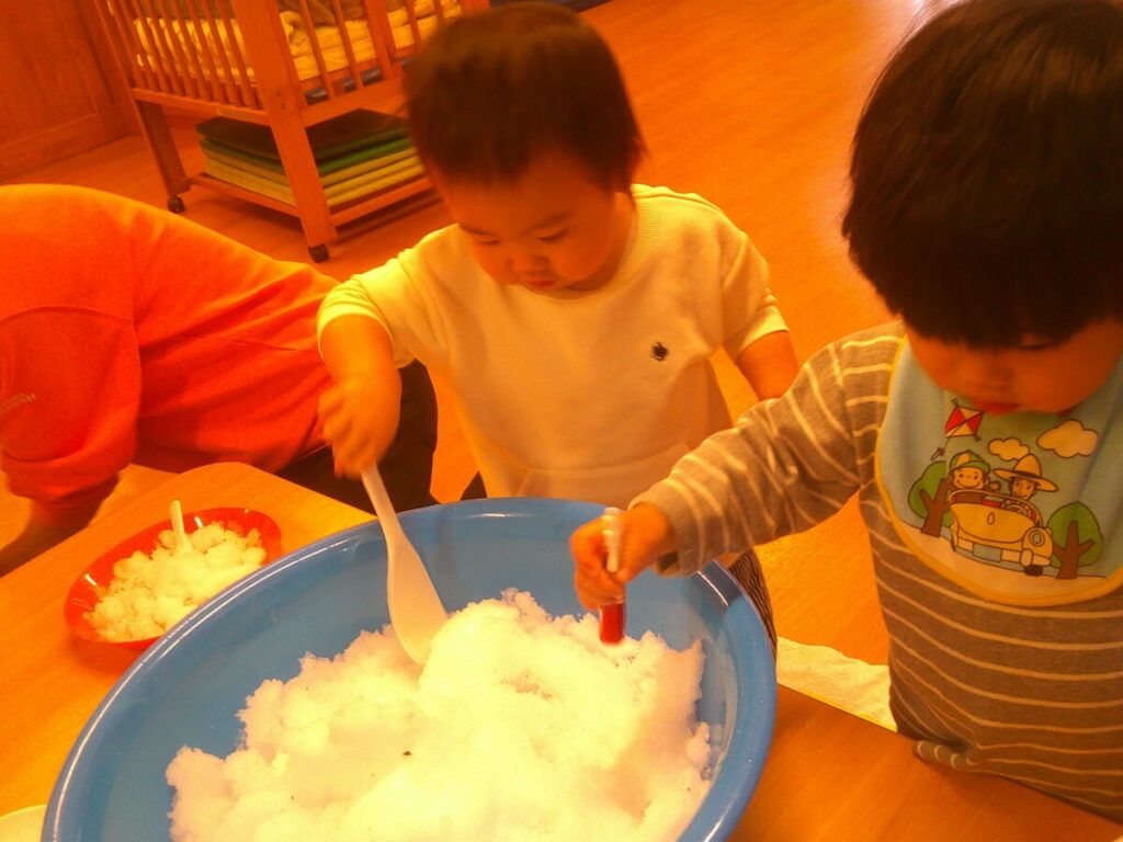 おままごとで使う容器にも雪を入れて、クサクと刺したりして楽しんでいました。