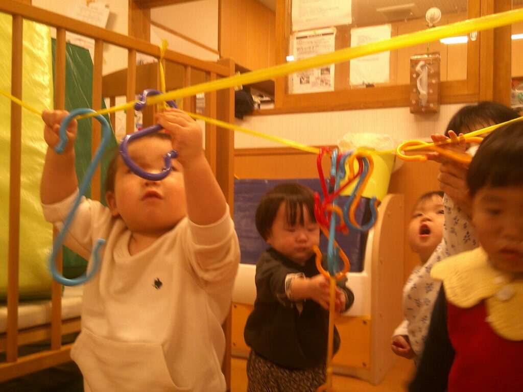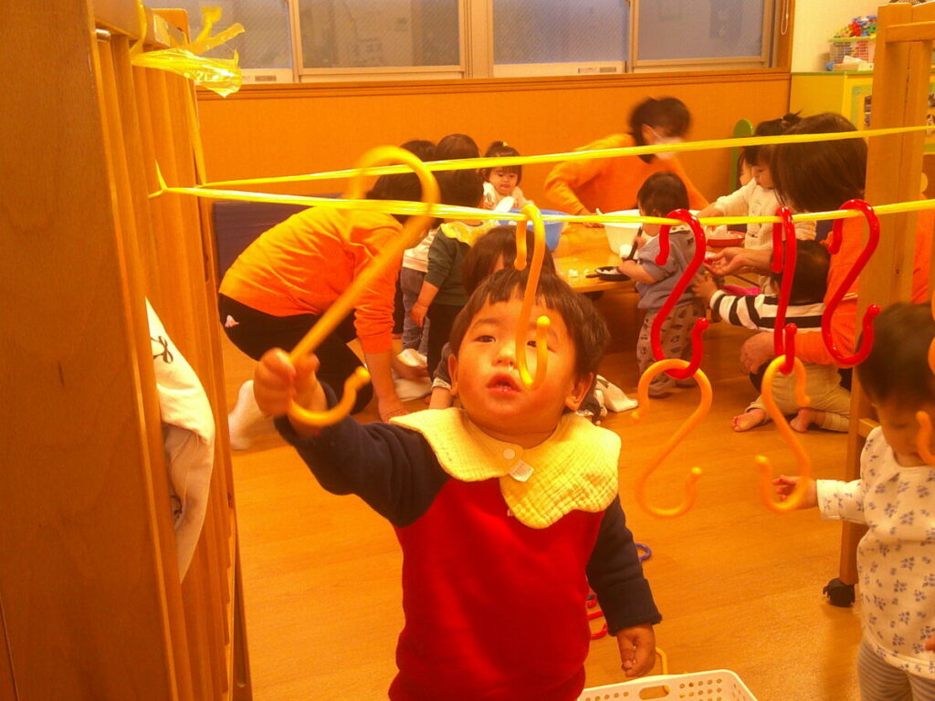 初めはどのようにしてあそべばいいのかも分からなかったお友だち。でも、保育者が遊び方を見せると頑張ってS字フックをかけようとしていました。