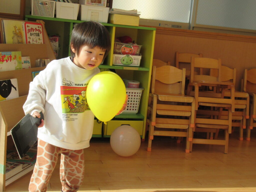 ひまわり組では風船を使って、羽子板あそびを行いました。