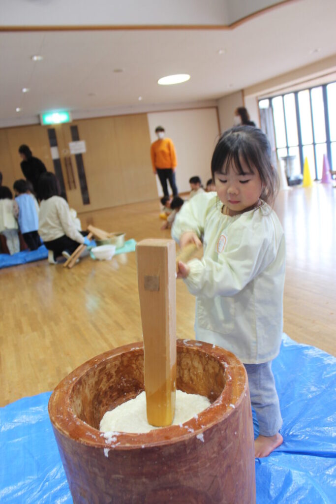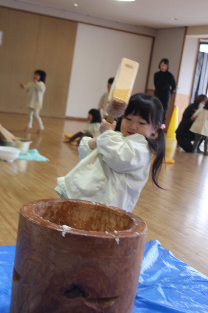 昔は杵と臼でお餅つきをしていました…と、体験です!