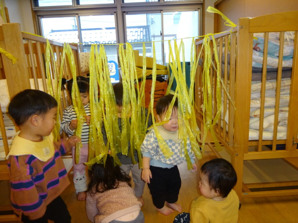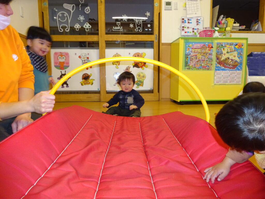 カーテンから「ばあ!!」と顔を出したり、勢いよく走ってくぐったり、ハイハイで下からそ~っとくぐってきたりと、みんなとっても楽しそうでした。