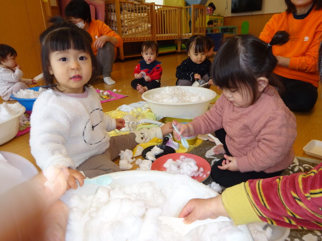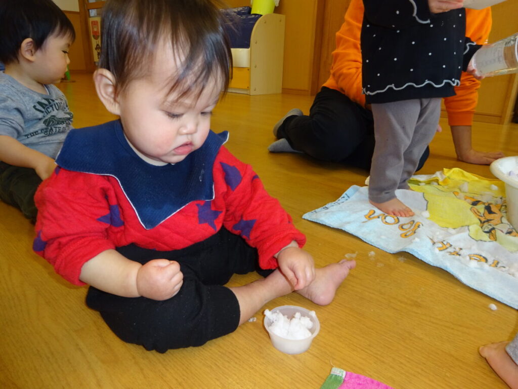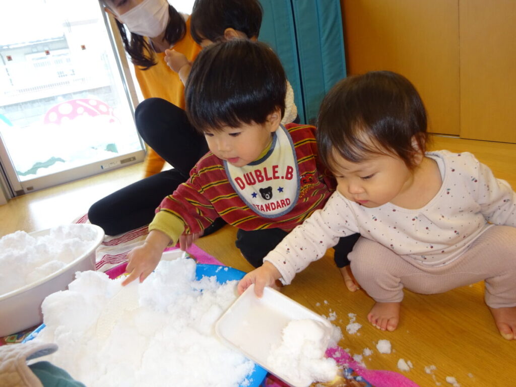 冷たいのが苦手なお友だちや、感触あそびが苦手なお友だちも雪に少し興味を持ち、触ってみようとしていました。