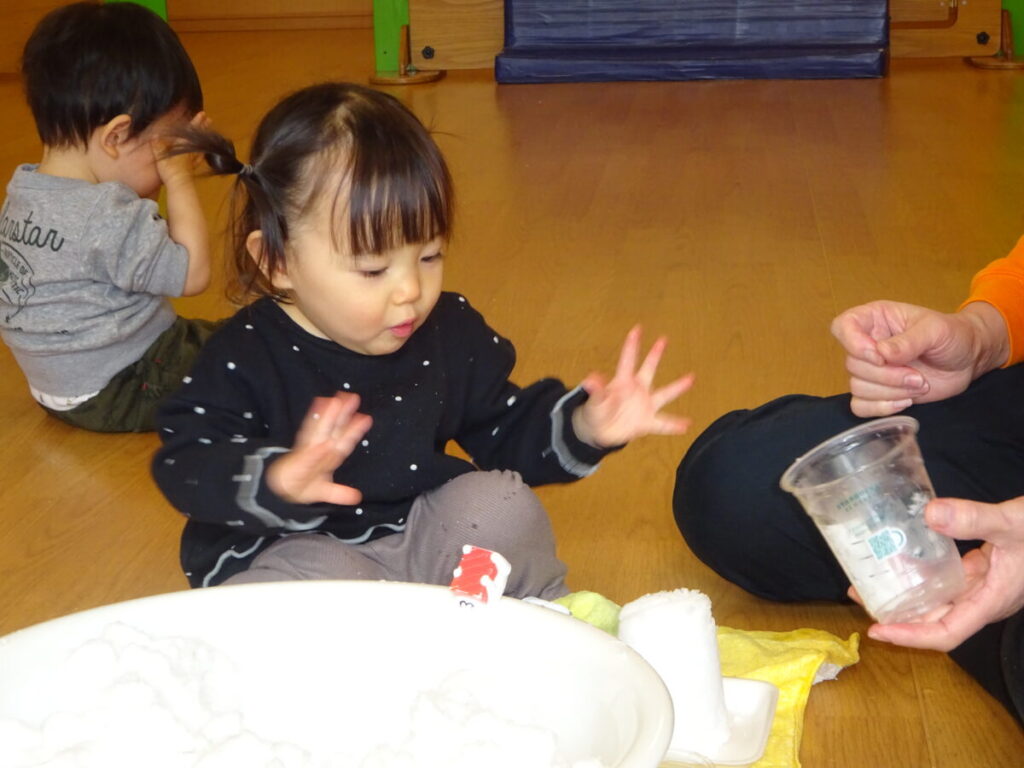 保育者がコップに入っていた雪をひっくり返すと、「うわーすごい!」と驚いた表情をしていました。