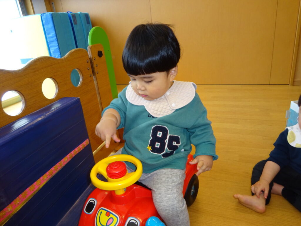 車が大好きなつくし組さんは、お友だちが乗っている車を押してくれたり、いろんな車に乗ったりして楽しんでいます。