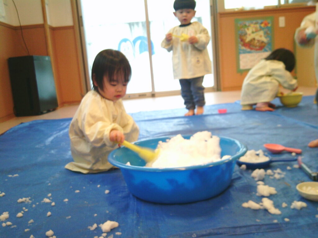 手で触ったり、スプーンですくって入れたり、また、型はめしてみたり、ぎゅっと丸めたり…