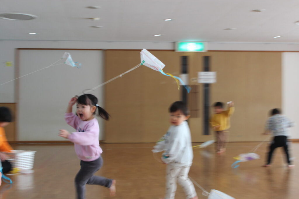 給食後に、おうちの人におてつだい頂いて作った凧を、あげました~!