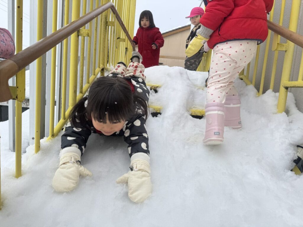 階段の所に雪があり、滑り台みたい!とスーパーマンで滑っていました!