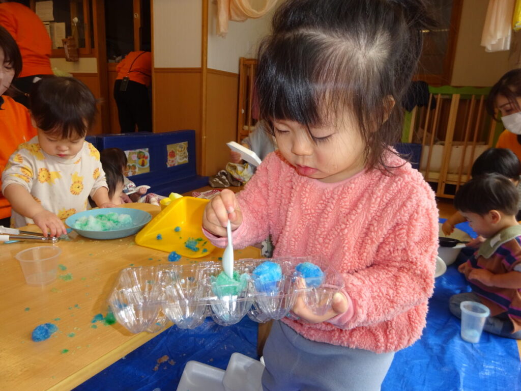 お皿から落ちた雪、冷たいけれど頑張って手でつまんで入れていたお友だちや、冷たくても平気でギューっと握っていたお友だちもいましたよ。