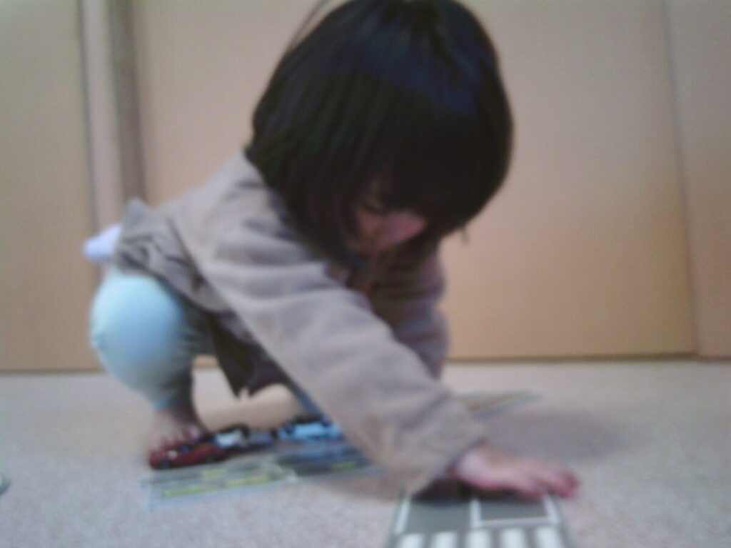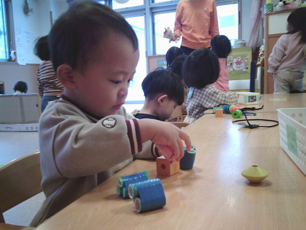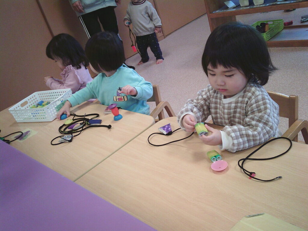 こちらは、ひもを通す積み木やホースを器用に立てて並べています。