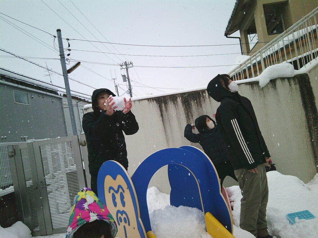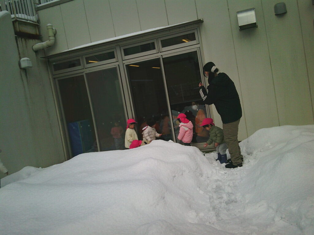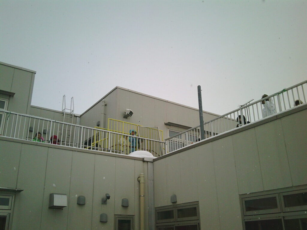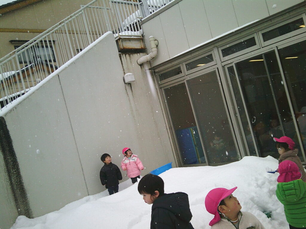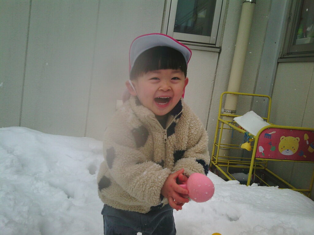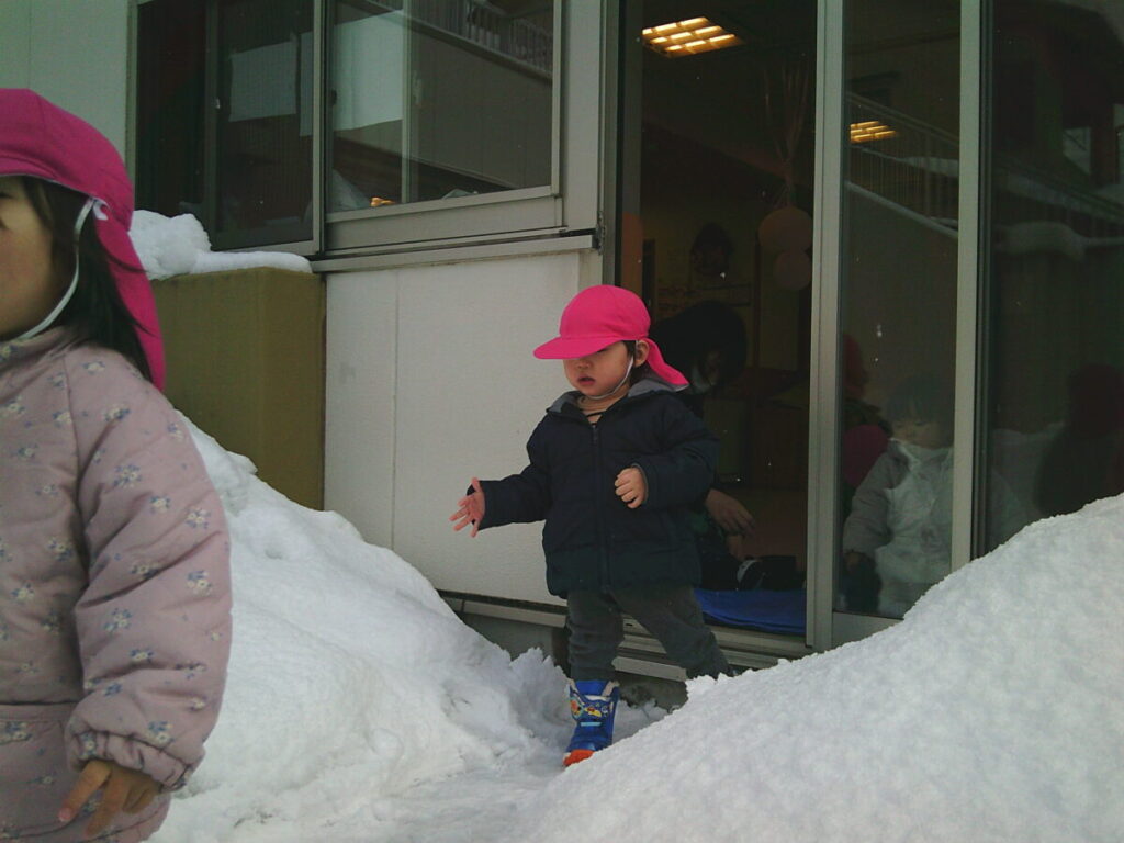 二歳児さんが、二階のベランダで雪遊びをしていました。