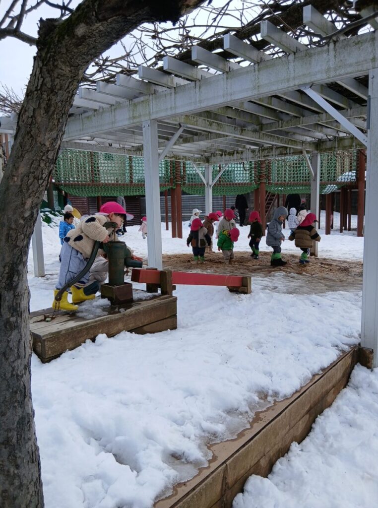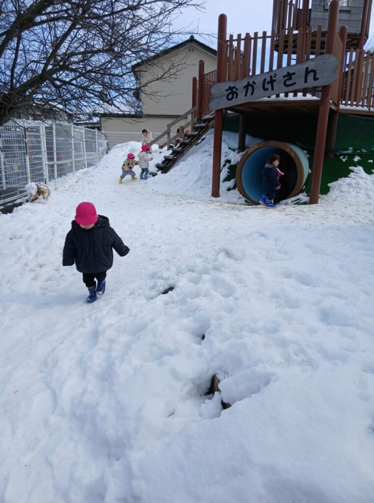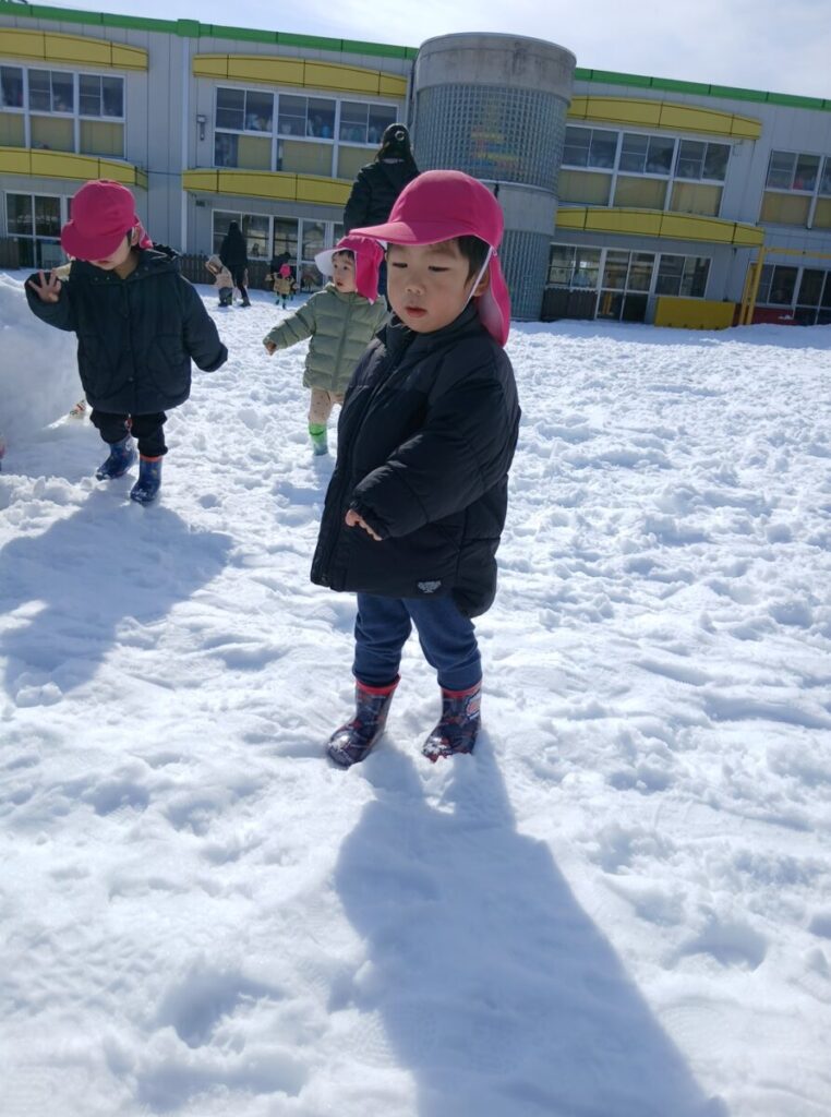 今日もいい天気、今日も園庭で雪遊びを楽しみました。