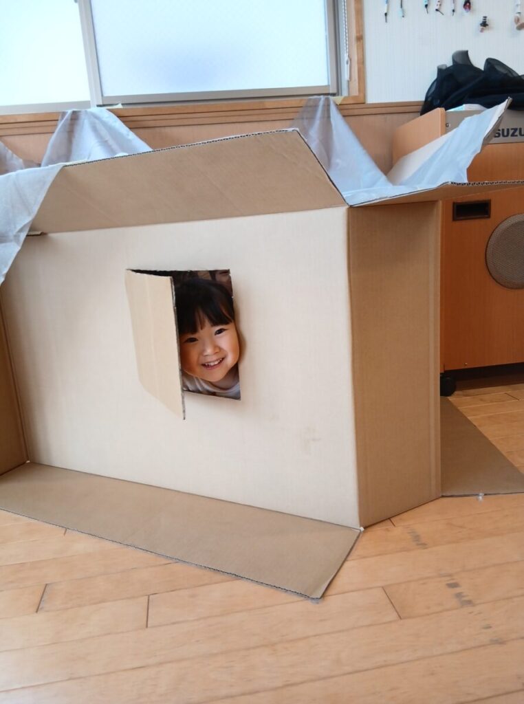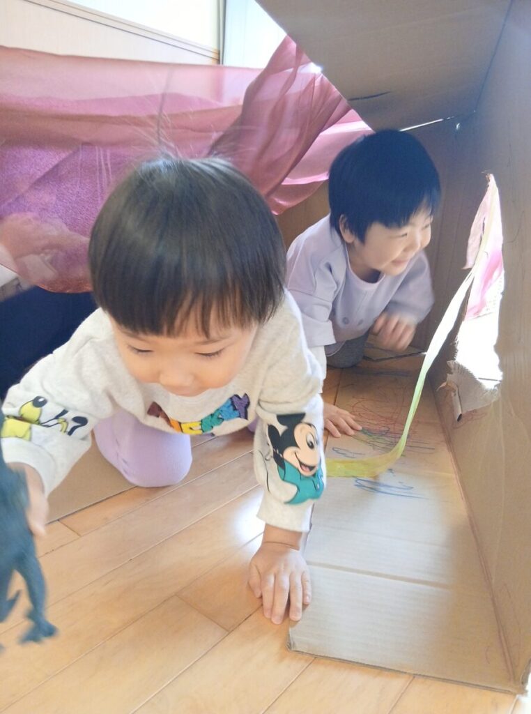先日遊んだ段ボールの家?に布を足して。