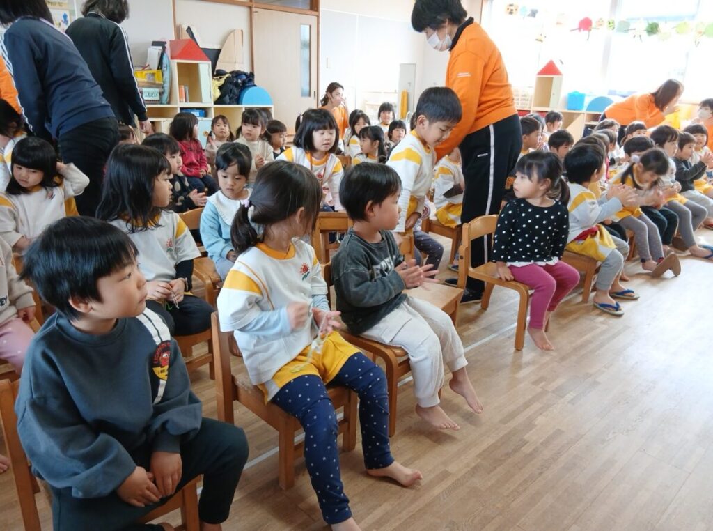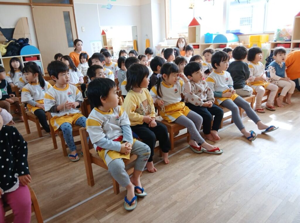 年少組さんから始まる月刊絵本の読み聞かせを聞かせていただきました。