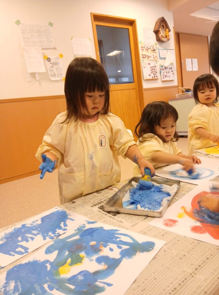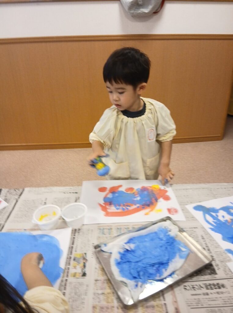 少しだけ絵の具をつけてみるお友達、豪快に触るお友達、