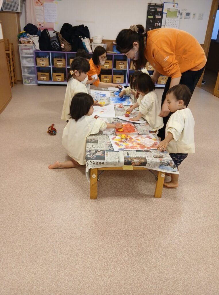 手で触ってみるお友達もいて、かわいい手形をつけたりもしていました。