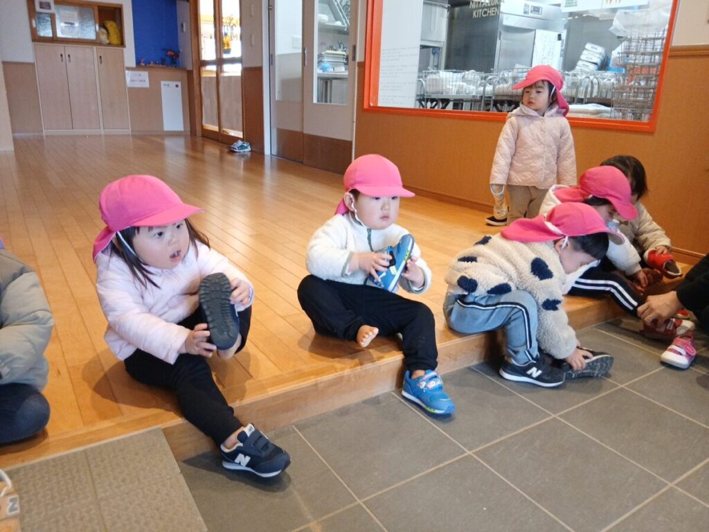 自分で靴を持ってきて、履いています。