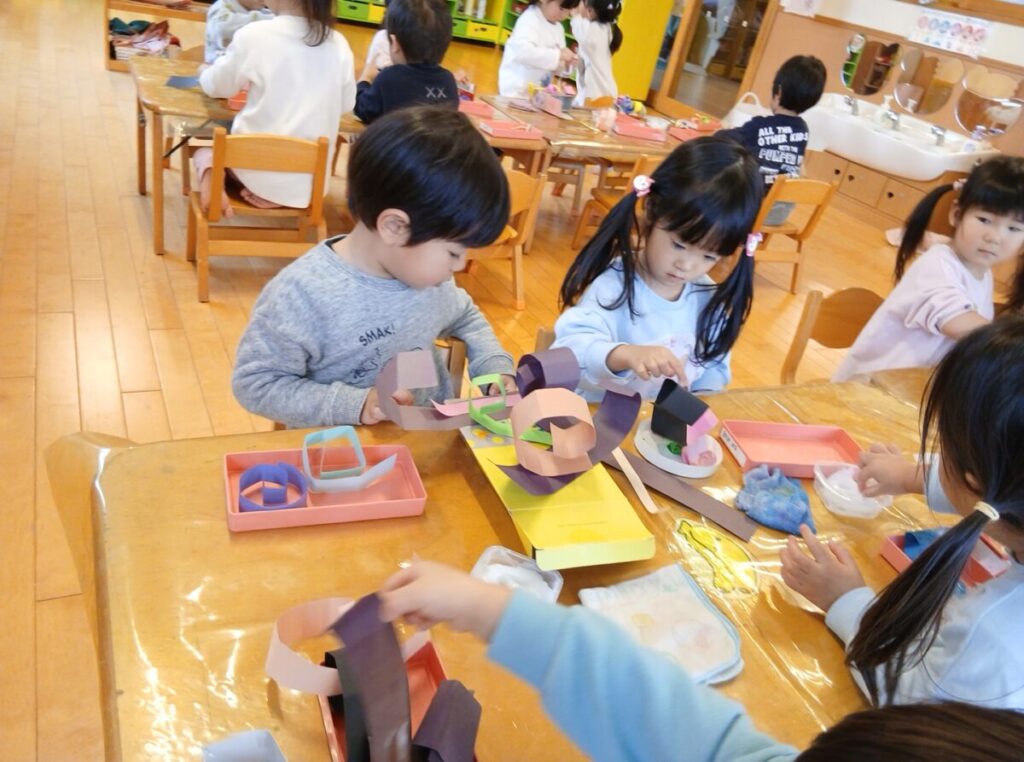 その後、紙帯プラスのり+菓子箱で制作あそびをしました。