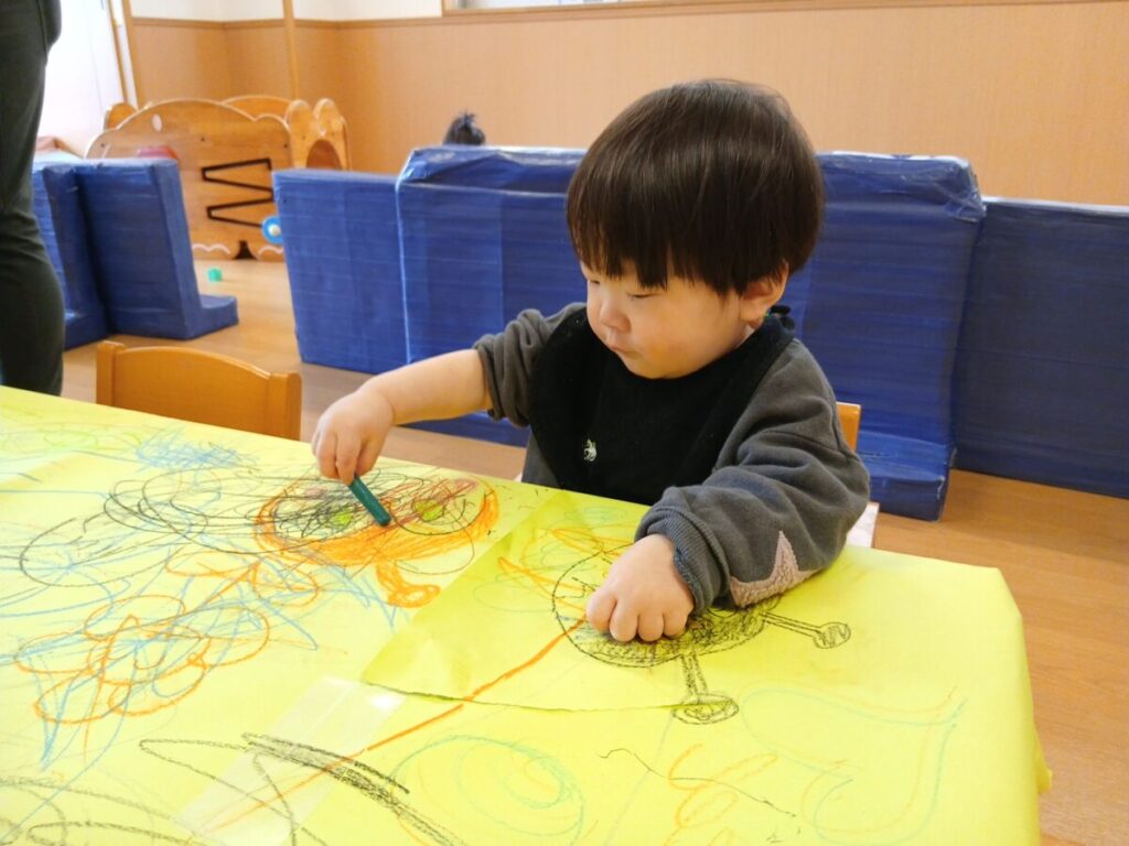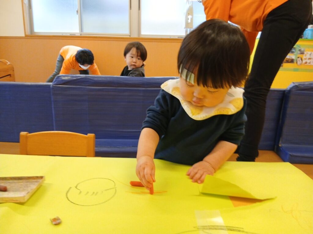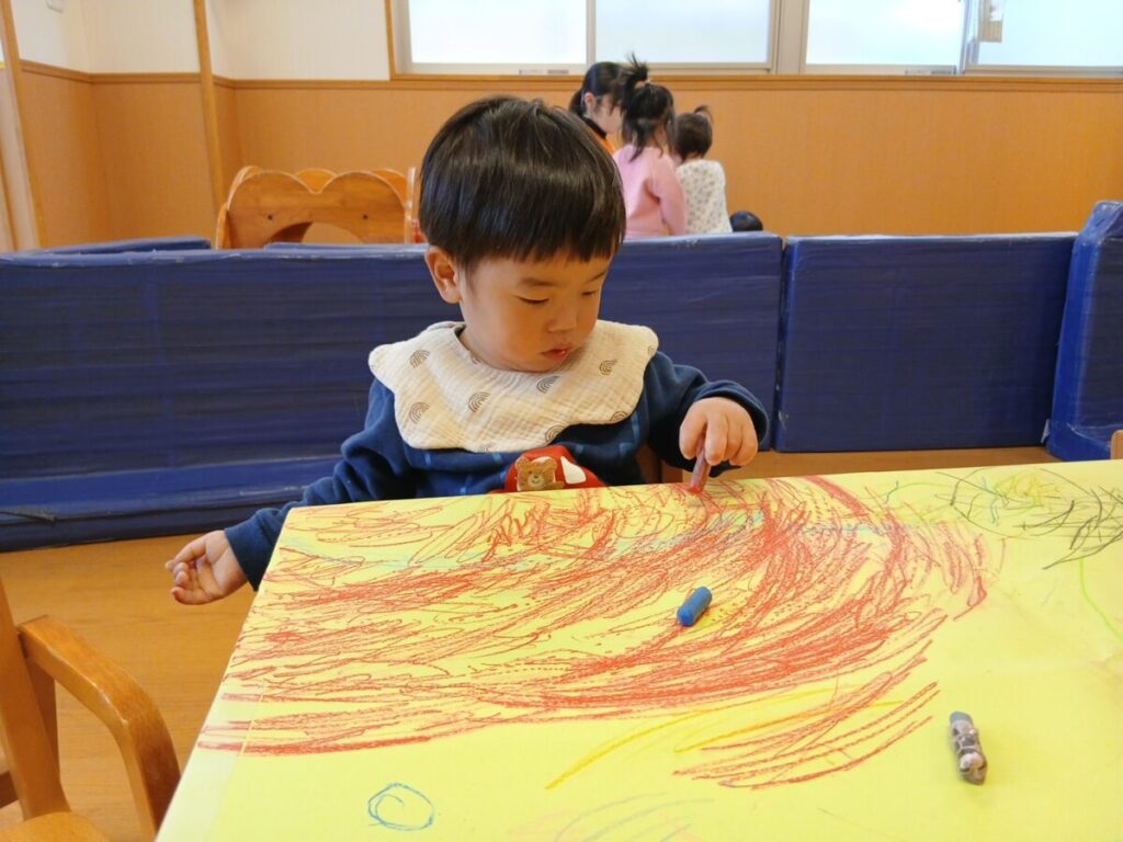 思い思いに好きなクレヨンを持って紙に描いていました。